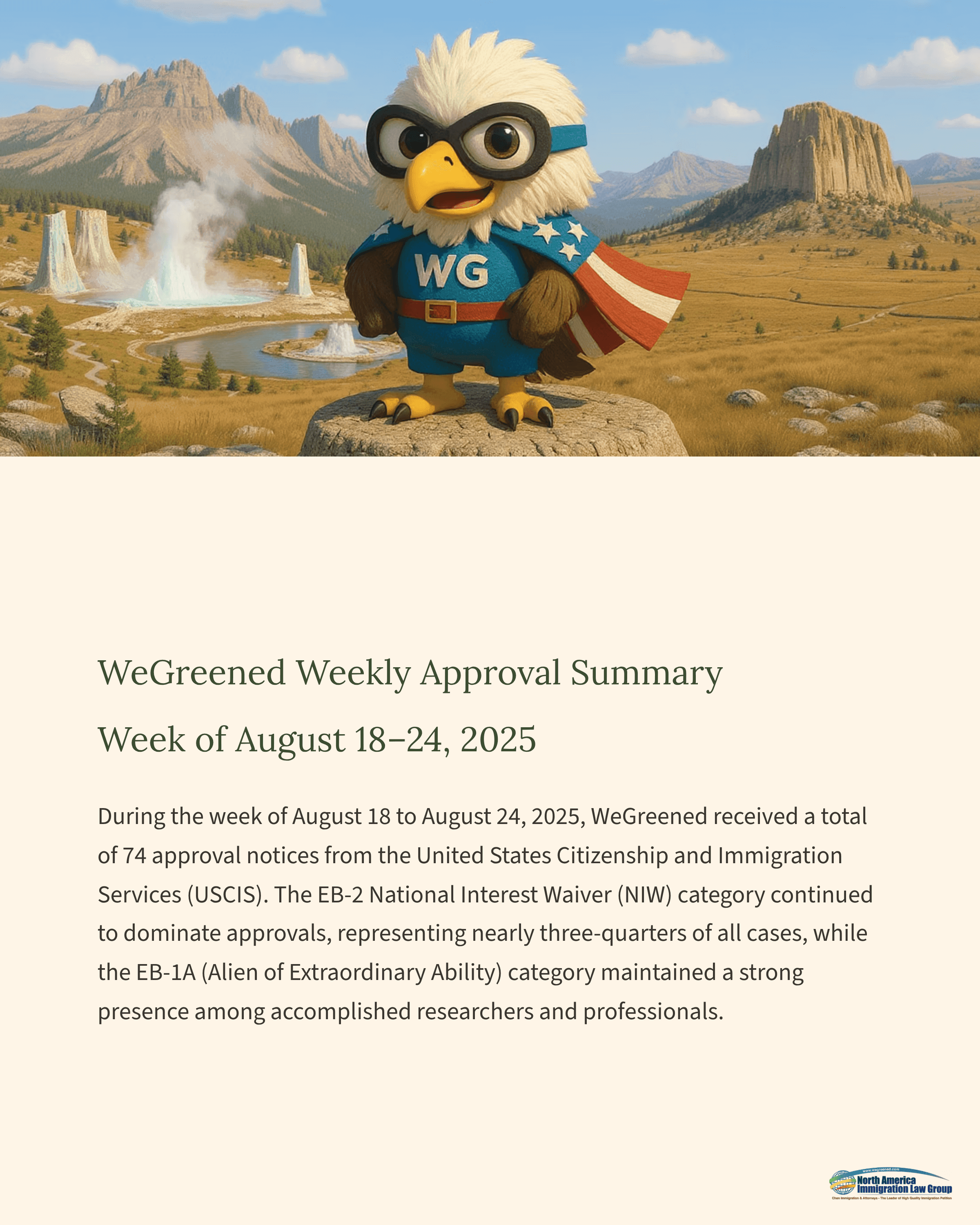 During the week of August 18 to August 24, 2025, WeGreened received a total of 74 approval notices from the United States Citizenship and Immigration Services (USCIS). The EB-2 National Interest Waiver (NIW) category continued to dominate approvals, representing nearly three-quarters of all cases, while the EB-1A (Alien of Extraordinary Ability) category maintained a strong presence among accomplished researchers and professionals.