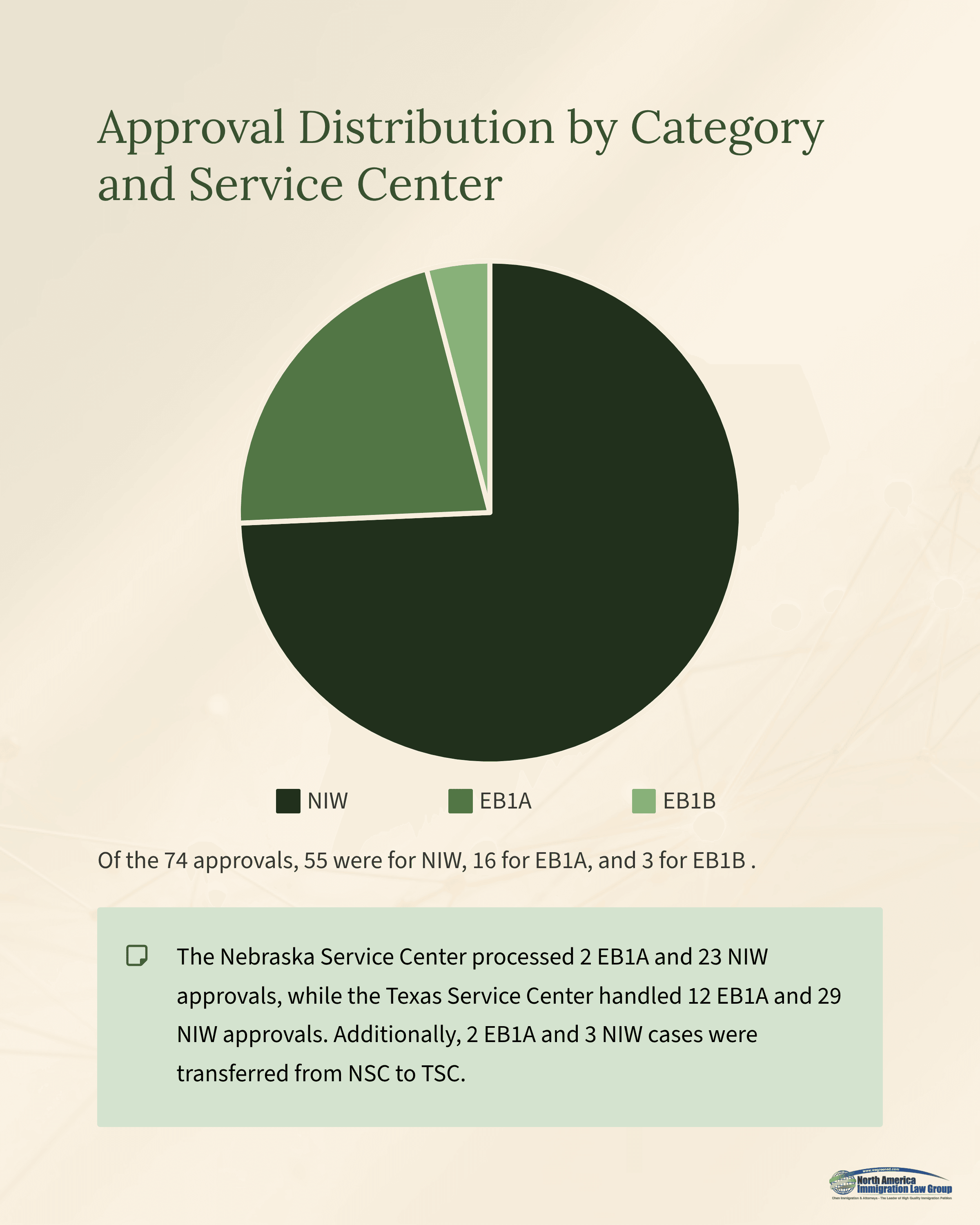 Of the 74 approvals, 55 were for NIW, 16 for EB1A, and 3 for EB1B (Outstanding Professors or Researchers).The Nebraska Service Center processed 2 EB1A and 23 NIW approvals, while the Texas Service Center handled 12 EB1A and 29 NIW approvals. Additionally, 2 EB1A and 3 NIW cases were transferred from NSC to TSC.