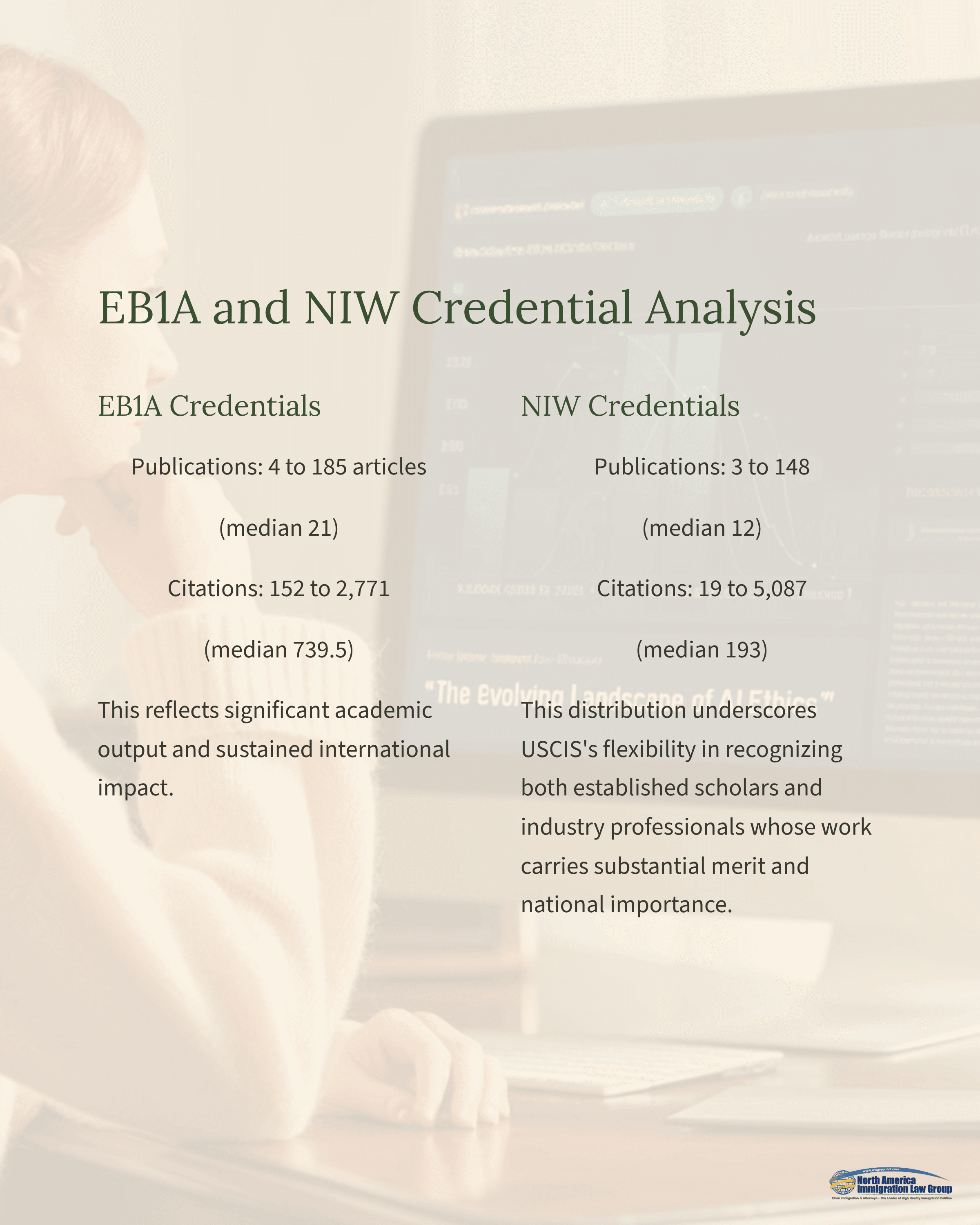 EB1A petitioners demonstrated strong scholarly productivity, with publications ranging from 4 to 185 articles (median 21) and citations between 152 and 2,771 (median 739.5). This reflects significant academic output and sustained international impact.NIW petitioners showed a broader range of academic profiles, with publication counts from 3 to 148 (median 12) and citations between 19 and 5,087 (median 193). This distribution underscores USCIS’s flexibility in recognizing both established scholars and industry professionals whose work carries substantial merit and national importance.