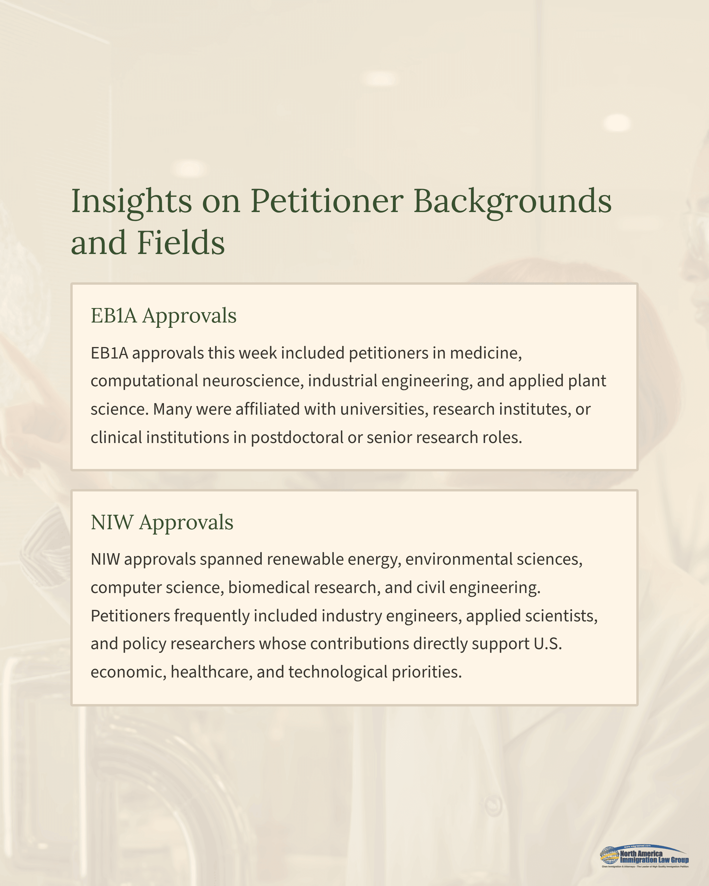 EB1A approvals this week included petitioners in medicine, computational neuroscience, industrial engineering, and applied plant science. Many were affiliated with universities, research institutes, or clinical institutions in postdoctoral or senior research roles.NIW approvals spanned renewable energy, environmental sciences, computer science, biomedical research, and civil engineering. Petitioners frequently included industry engineers, applied scientists, and policy researchers whose contributions directly support U.S. economic, healthcare, and technological priorities.
