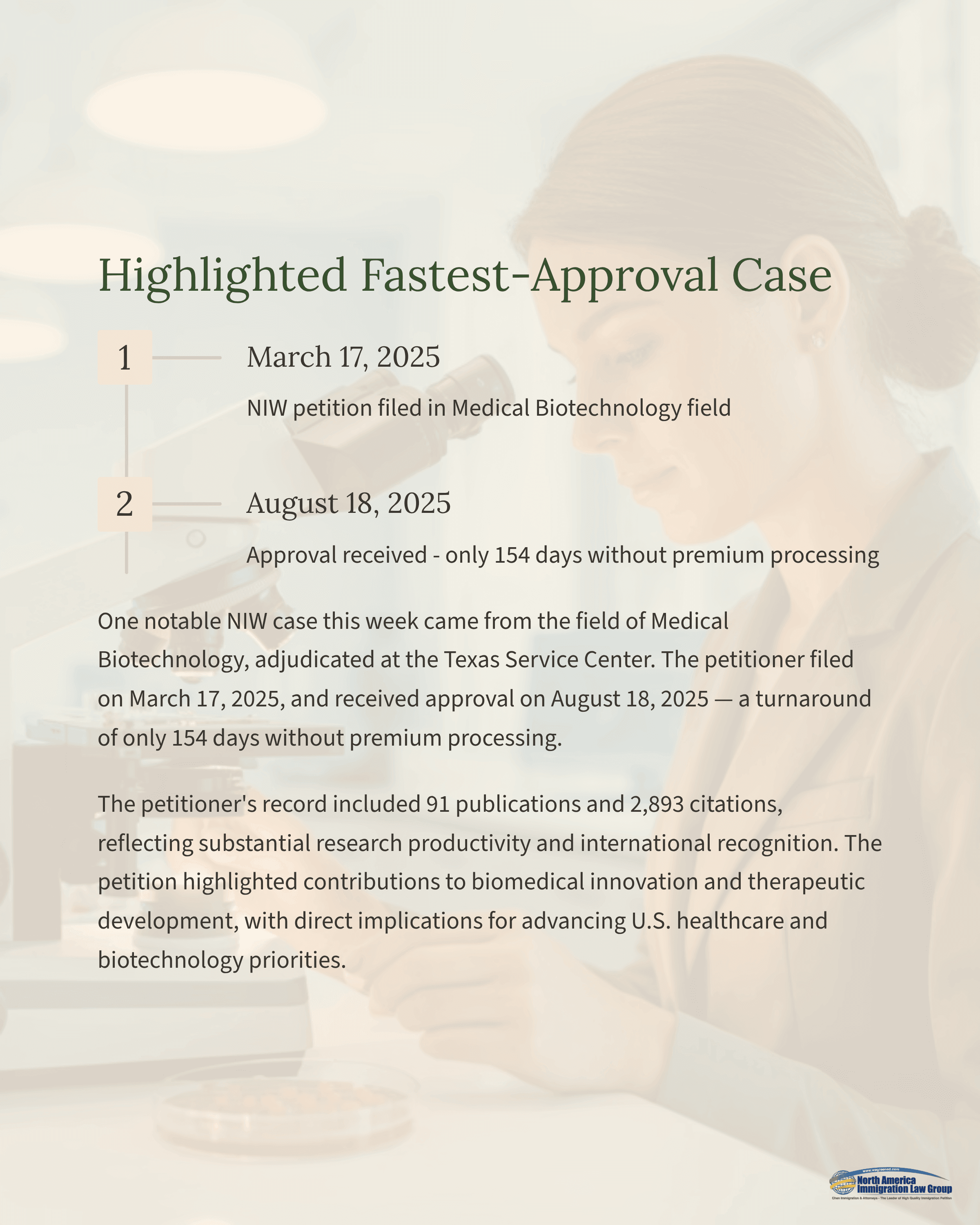 One notable NIW case this week came from the field of Medical Biotechnology, adjudicated at the Texas Service Center. The petitioner filed on March 17, 2025, and received approval on August 18, 2025 — a turnaround of only 154 days without premium processing.The petitioner’s record included 91 publications and 2,893 citations, reflecting substantial research productivity and international recognition. The petition highlighted contributions to biomedical innovation and therapeutic development, with direct implications for advancing U.S. healthcare and biotechnology priorities.