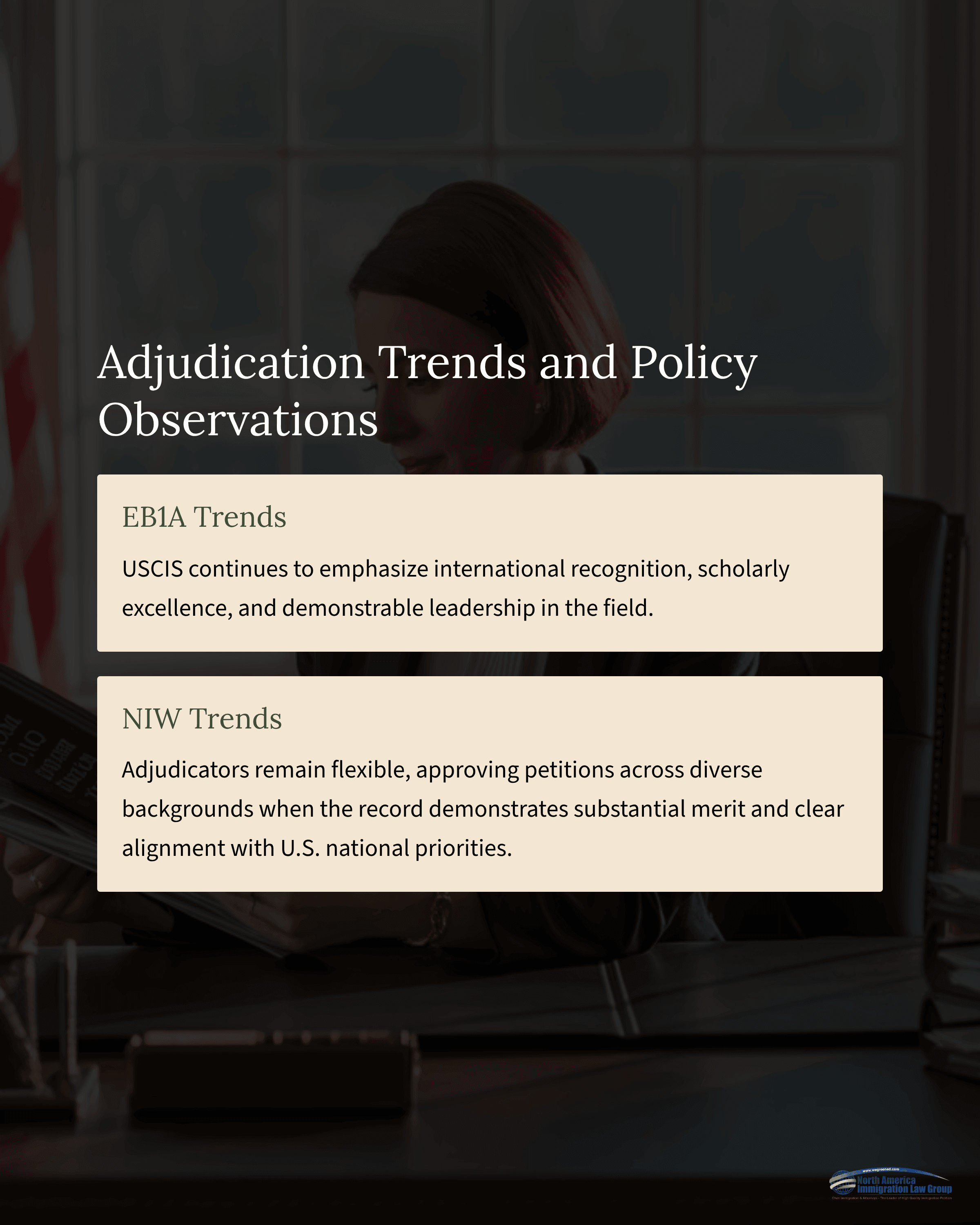 EB1A: USCIS continues to emphasize international recognition, scholarly excellence, and demonstrable leadership in the field.NIW: Adjudicators remain flexible, approving petitions across diverse backgrounds when the record demonstrates substantial merit and clear alignment with U.S. national priorities.