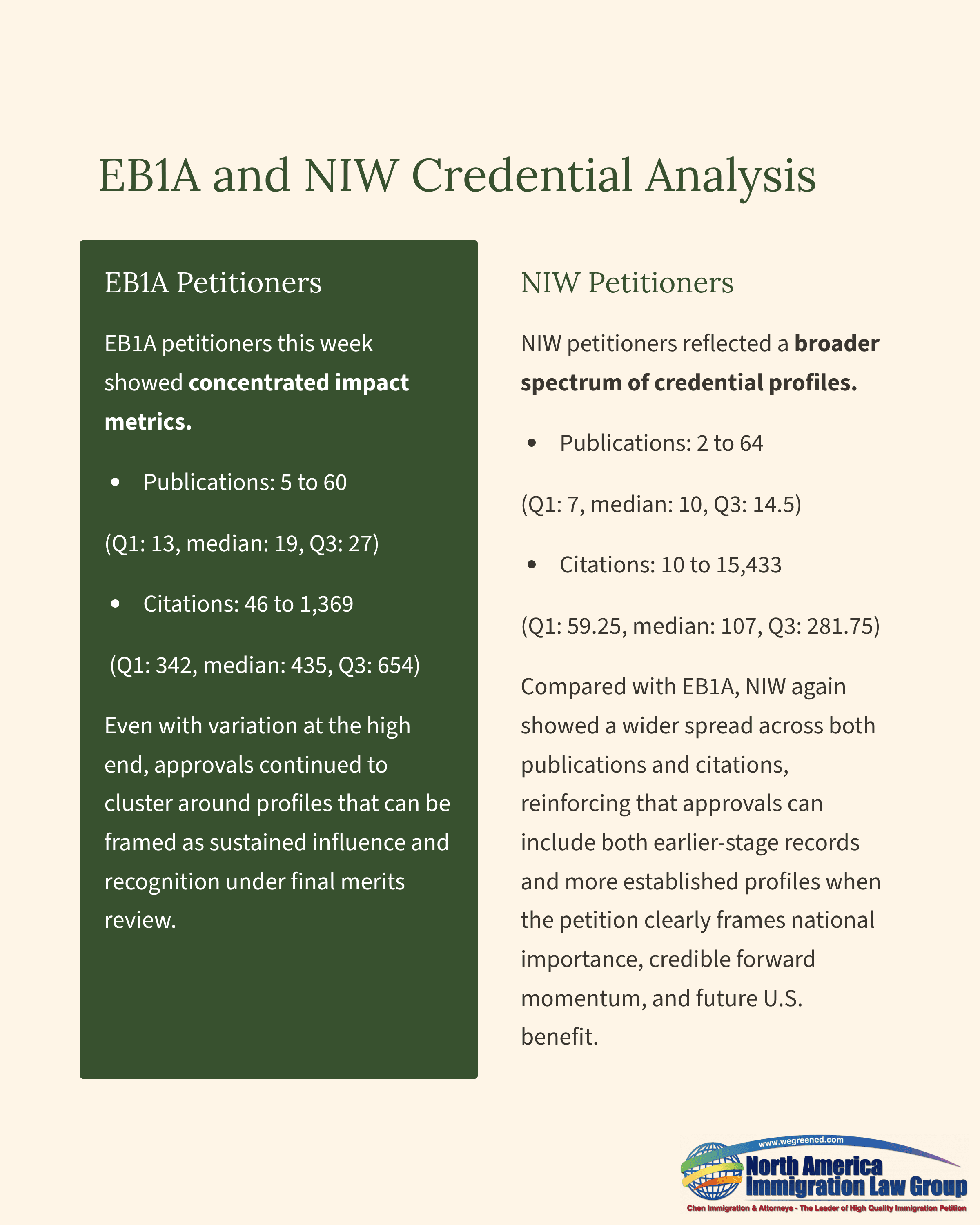 EB1A petitioners this week showed concentrated impact metrics. Publications ranged from 5 to 60 (Q1: 13, median: 19, Q3: 27), and citations ranged from 46 to 1,369 (Q1: 342, median: 435, Q3: 654). Even with variation at the high end, approvals continued to cluster around profiles that can be framed as sustained influence and recognition under final merits review.NIW petitioners reflected a broader spectrum of credential profiles. Publications ranged from 2 to 64 (Q1: 7, median: 10, Q3: 14.5), and citations ranged from 10 to 15,433 (Q1: 59.25, median: 107, Q3: 281.75). Compared with EB1A, NIW again showed a wider spread across both publications and citations, reinforcing that approvals can include both earlier-stage records and more established profiles when the petition clearly frames national importance, credible forward momentum, and future U.S. benefit.