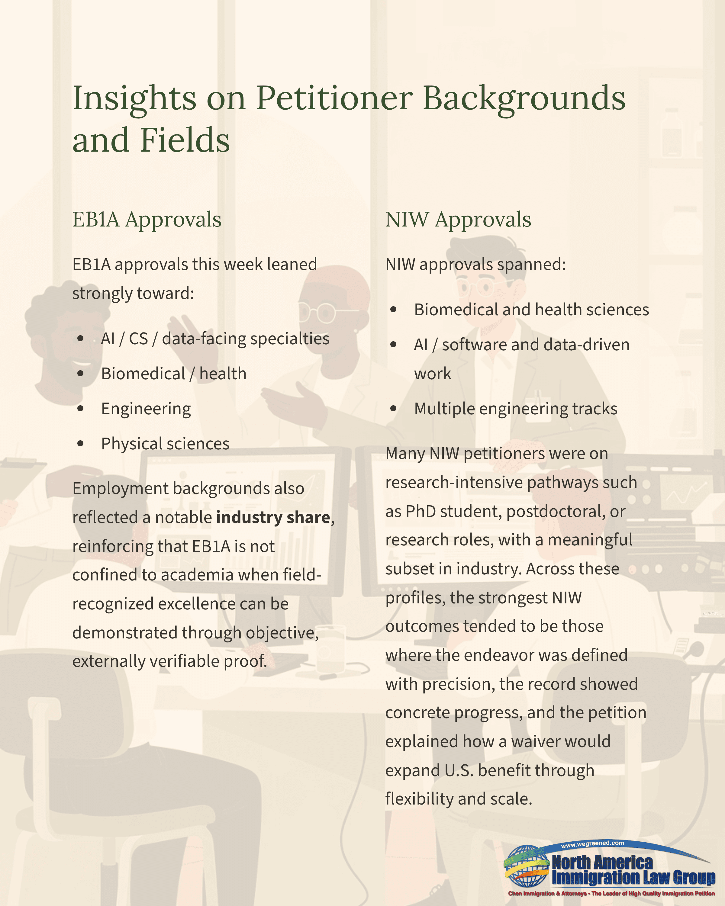 EB1A approvals this week leaned strongly toward AI/CS/data-facing specialties, alongside biomedical/health, engineering, and physical sciences. Employment backgrounds also reflected a notable industry share, reinforcing that EB1A is not confined to academia when field-recognized excellence can be demonstrated through objective, externally verifiable proof.NIW approvals spanned biomedical and health sciences, AI/software and data-driven work, and multiple engineering tracks. Many NIW petitioners were on research-intensive pathways such as PhD student, postdoctoral, or research roles, with a meaningful subset in industry. Across these profiles, the strongest NIW outcomes tended to be those where the endeavor was defined with precision, the record showed concrete progress, and the petition explained how a waiver would expand U.S. benefit through flexibility and scale.