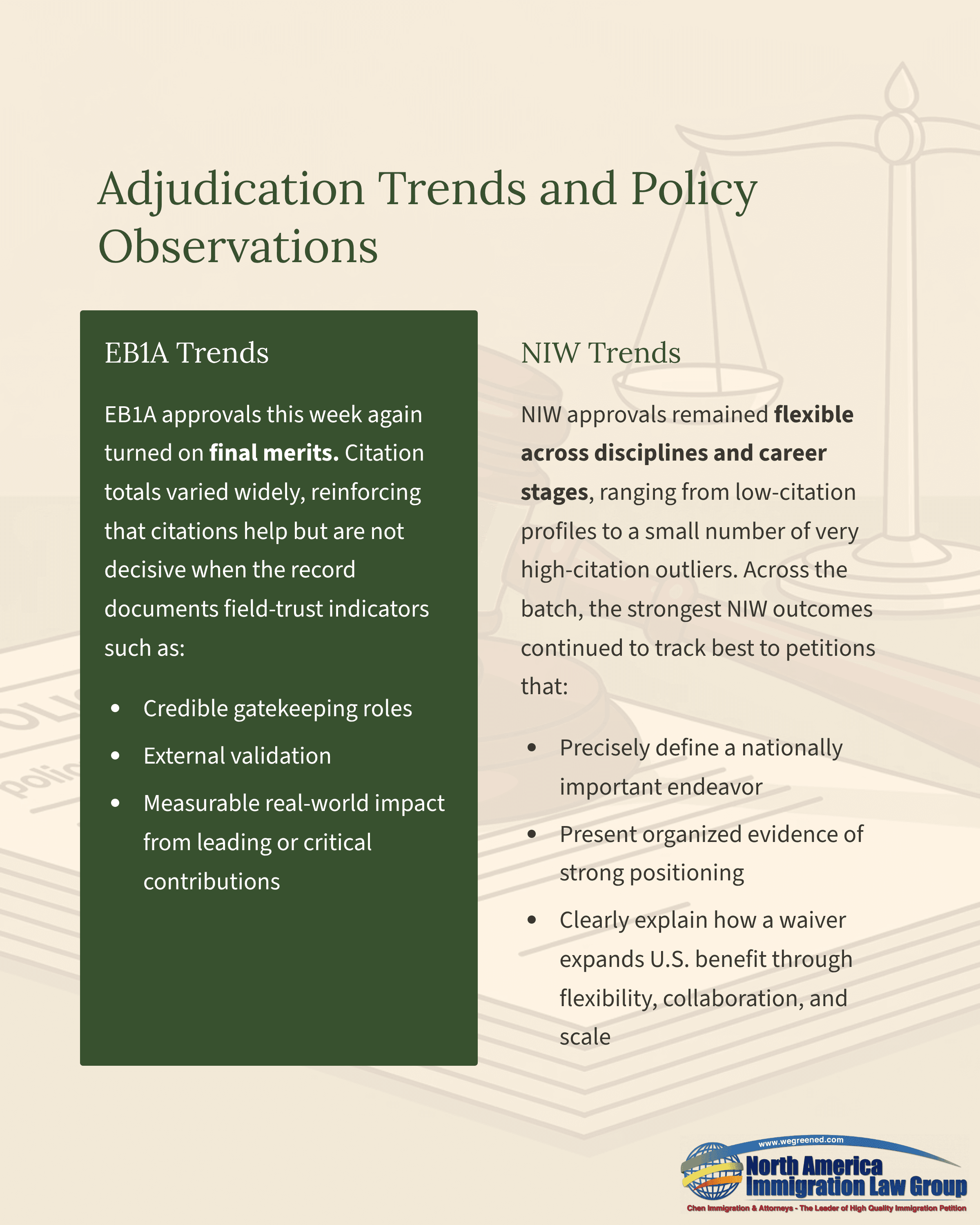 EB1A approvals this week again hinged on a compelling final merits showing. Citation totals varied substantially, and this dataset included an EB1A approval at the lowest citation end of the week’s EB1A range, reinforcing that citations can be helpful but not determinative when the record clearly documents field-trust indicators such as credible gatekeeping roles, external validation, and leading/critical contributions with measurable real-world significance.NIW approvals continued to reflect broad flexibility across disciplines and career stages, spanning from the low end of citations through one extreme high-citation outlier at the top end. Across the batch, the consistent throughline remained unchanged: the strongest NIW outcomes tracked best to petitions that precisely define a nationally important endeavor, present organized and concrete evidence showing the petitioner is well positioned, and clearly explain how a waiver expands U.S. benefit through flexibility, collaboration, and scale.