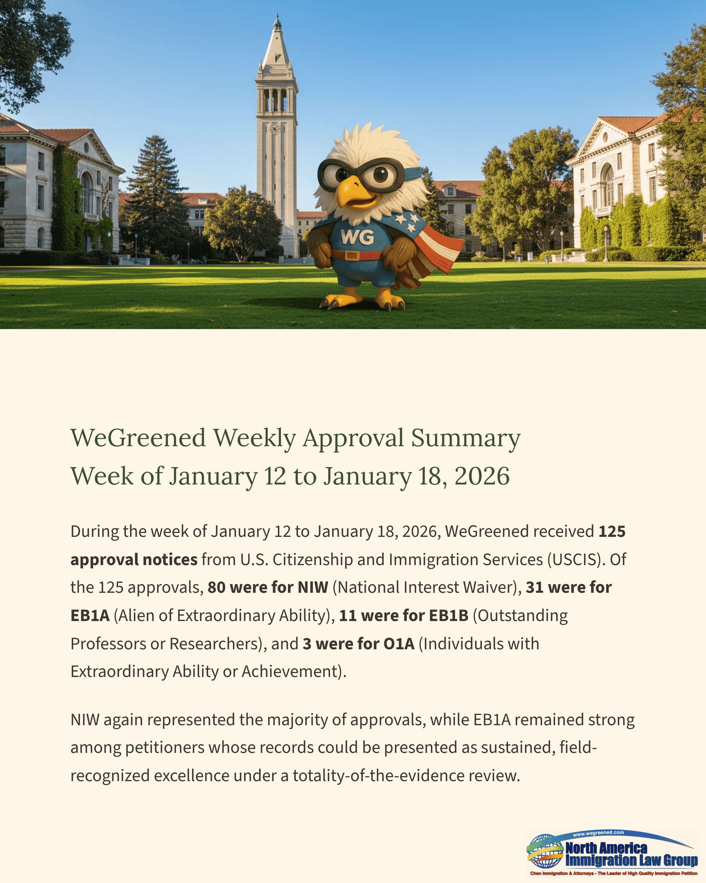 During the week of January 12 to January 18, 2026, WeGreened received 125 approval notices from U.S. Citizenship and Immigration Services (USCIS). Of the 125 approvals, 80 were for NIW (National Interest Waiver), 31 were for EB1A (Alien of Extraordinary Ability), 11 were for EB1B (Outstanding Professors or Researchers), and 3 were for O1A (Individuals with Extraordinary Ability or Achievement).