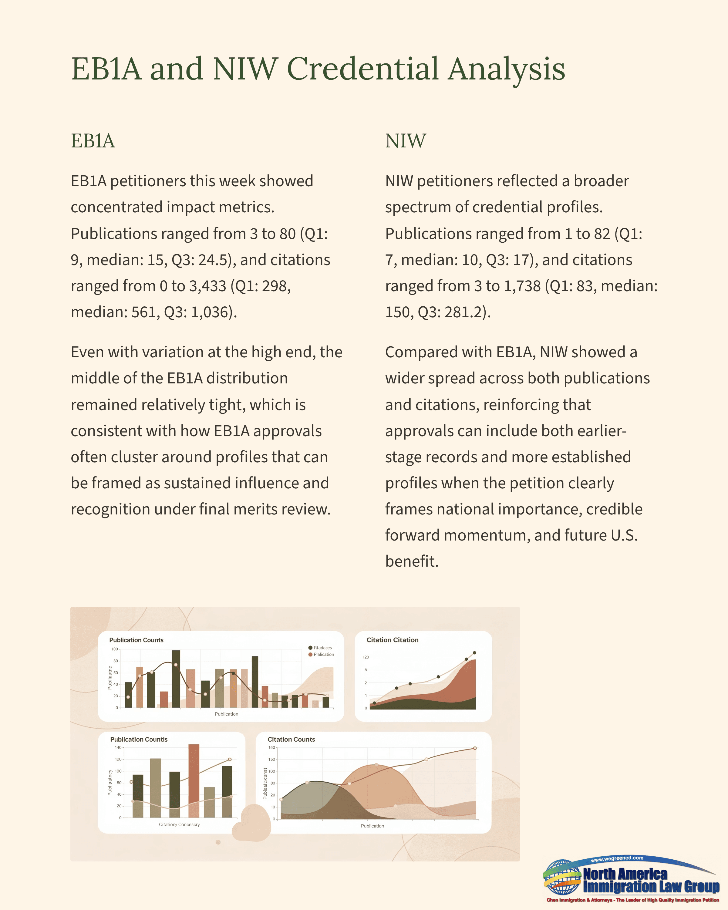 EB1A petitioners this week showed concentrated impact metrics. Publications ranged from 3 to 80 (Q1: 9, median: 15, Q3: 24.5), and citations ranged from 0 to 3,433 (Q1: 298, median: 561, Q3: 1,036). Even with variation at the high end, the middle of the EB1A distribution remained relatively tight, which is consistent with how EB1A approvals often cluster around profiles that can be framed as sustained influence and recognition under final merits review.NIW petitioners reflected a broader spectrum of credential profiles. Publications ranged from 1 to 82 (Q1: 7, median: 10, Q3: 17), and citations ranged from 3 to 1,738 (Q1: 83, median: 150, Q3: 281.2). Compared with EB1A, NIW showed a wider spread across both publications and citations, reinforcing that approvals can include both earlier-stage records and more established profiles when the petition clearly frames national importance, credible forward momentum, and future U.S. benefit.