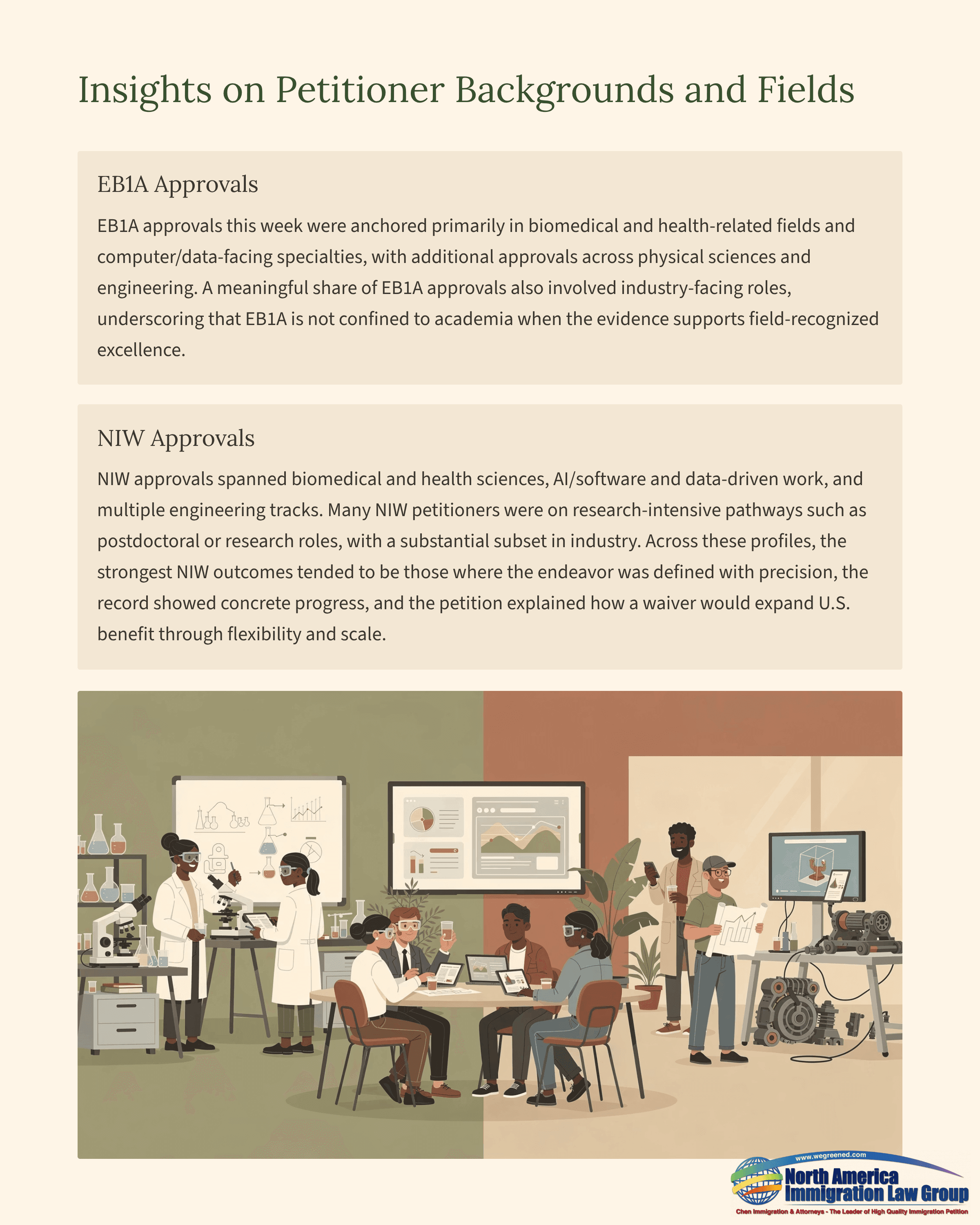EB1A approvals this week were anchored primarily in biomedical and health-related fields and computer/data-facing specialties, with additional approvals across physical sciences and engineering. A meaningful share of EB1A approvals also involved industry-facing roles, underscoring that EB1A is not confined to academia when the evidence supports field-recognized excellence.NIW approvals spanned biomedical and health sciences, AI/software and data-driven work, and multiple engineering tracks. Many NIW petitioners were on research-intensive pathways such as postdoctoral or research roles, with a substantial subset in industry. Across these profiles, the strongest NIW outcomes tended to be those where the endeavor was defined with precision, the record showed concrete progress, and the petition explained how a waiver would expand U.S. benefit through flexibility and scale.
