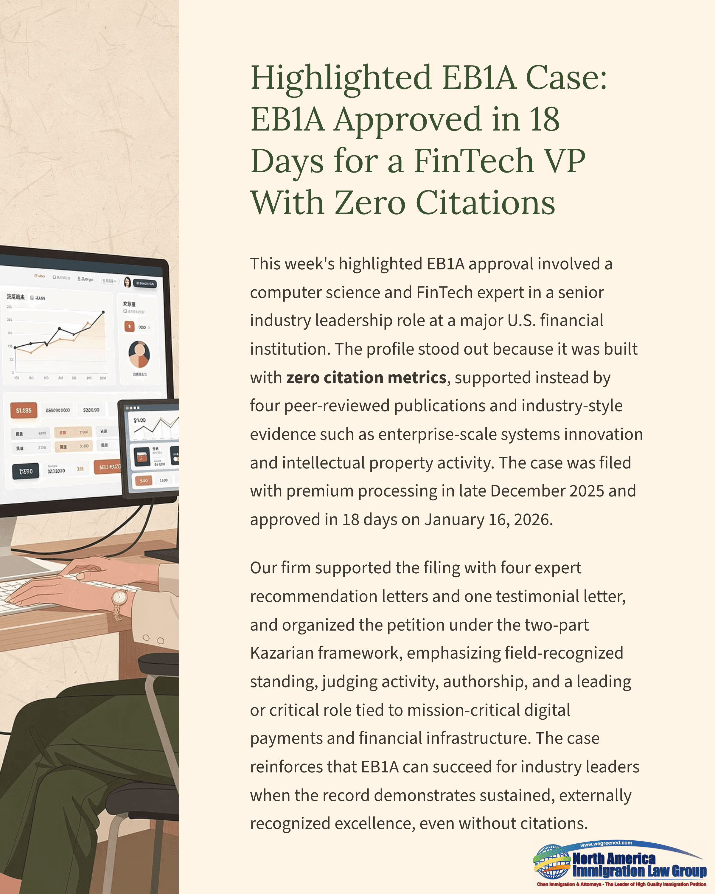 One notable EB1A approval this week involved a computer science and financial technology expert working in a senior, industry-facing leadership role as a vice president and lead software engineer at a major U.S. financial institution. What makes this case stand out is that the profile did not rely on citation metrics at all. The record included four peer-reviewed publications with zero citations, along with technical and professional contributions more typical of high-impact industry tracks, such as enterprise-scale systems innovation and intellectual property activity. The petition was filed with premium processing in late December 2025 and approved in 18 days (approval date: January 16, 2026). To strengthen third-party validation, our firm prepared four expert recommendation letters and one testimonial letter, designed to translate the petitioner’s real-world influence into evidence that fits EB1A’s legal framework.Strategically, we structured the filing under the two-part Kazarian approach and focused on evidence that USCIS officers can evaluate clearly even when academic metrics are not the core story. On the regulatory criteria side, we documented field-recognized standing through selective professional memberships (including senior-level recognition within major technical associations), sustained judging activity for respected technology and innovation awards and venues, and scholarly authorship paired with technical credibility. We also supported the leading or critical role element by tying the petitioner’s responsibilities to mission-critical work in digital payments and secure financial infrastructure at a distinguished organization. In the final merits analysis, we connected these criteria into a single narrative of sustained acclaim by showing how the petitioner’s work advanced real-time, high-reliability payment systems and strengthened large-scale validation frameworks that support security, scalability, and trust in U.S. financial technology.