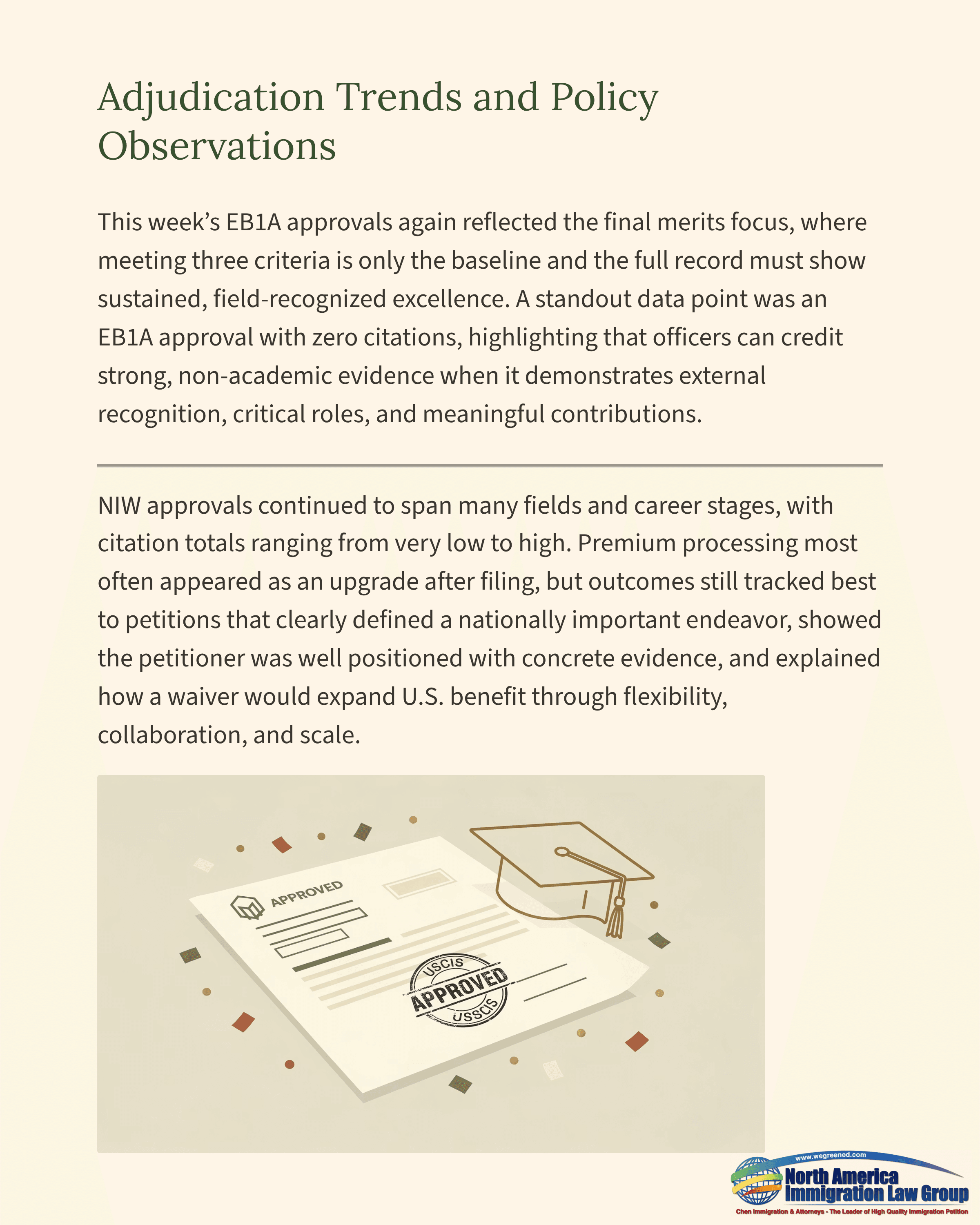 EB1A approvals this week again turned on sustained acclaim and final merits, where meeting three criteria is only the threshold and the total record must add up to field-recognized excellence. A notable data point this week is that EB1A approvals included a zero-citation profile, reinforcing that officers can credit non-academic, field-appropriate proof when the evidence clearly demonstrates external recognition, critical roles, and consequential contributions that extend beyond internal job performance.NIW approvals continued to span diverse disciplines and career stages, with outcomes this week stretching across a very wide citation range, including approvals at the lowest end of the dataset. At the same time, the most common procedural pattern for NIW approvals was premium processing used as an upgrade after filing rather than an upfront request. The consistent throughline, however, remained unchanged: approvals tracked best to petitions that precisely defined a nationally important endeavor, organized concrete evidence to show the petitioner was well positioned, and clearly explained how a waiver would expand U.S. benefit through flexibility, collaboration, and scale.