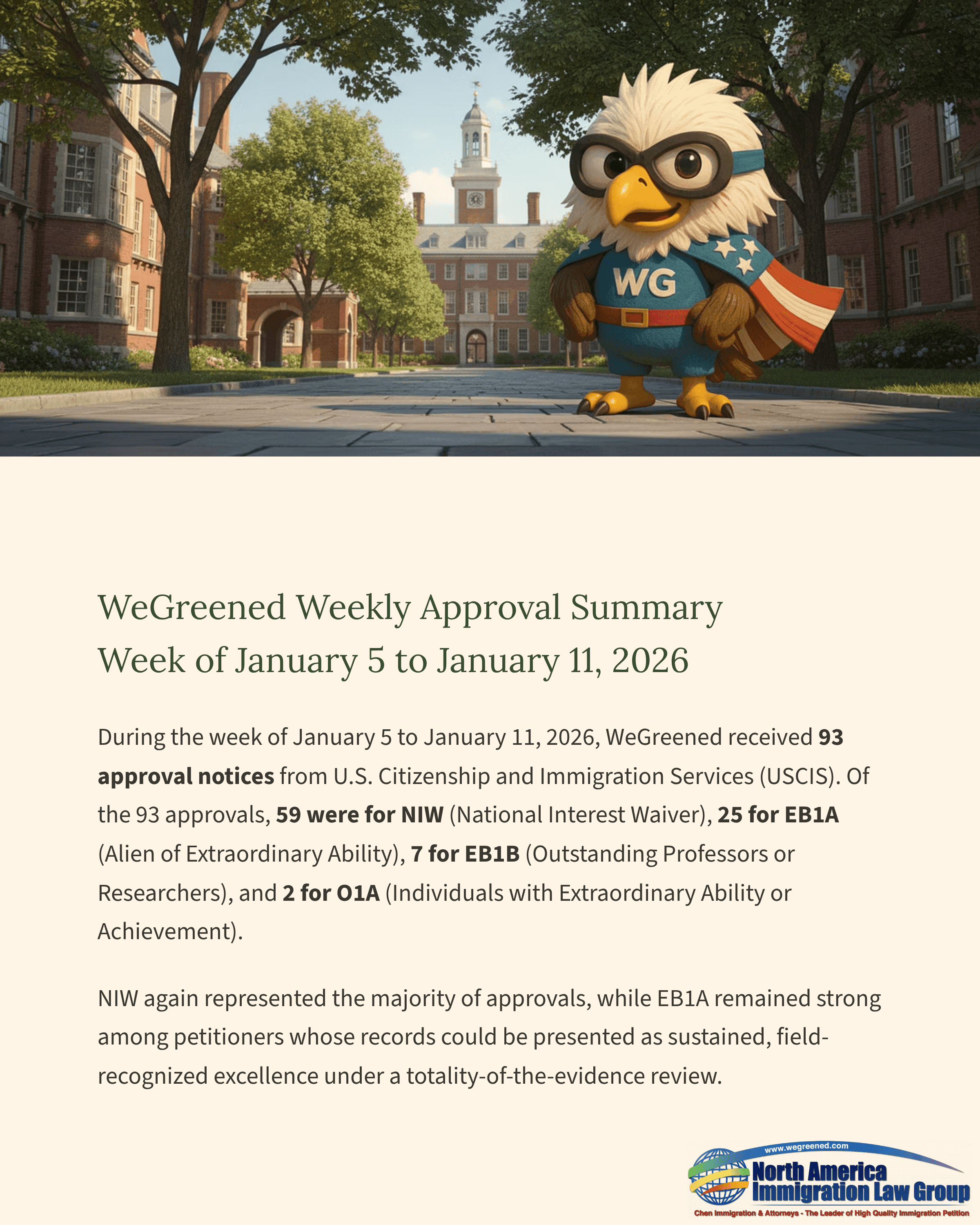 During the week of January 5 to January 11, 2026, WeGreened received 93 approval notices from U.S. Citizenship and Immigration Services (USCIS). Of the 93 approvals, 59 were for NIW (National Interest Waiver), 25 for EB1A (Alien of Extraordinary Ability), 7 for EB1B (Outstanding Professors or Researchers), and 2 for O1A (Individuals with Extraordinary Ability or Achievement).