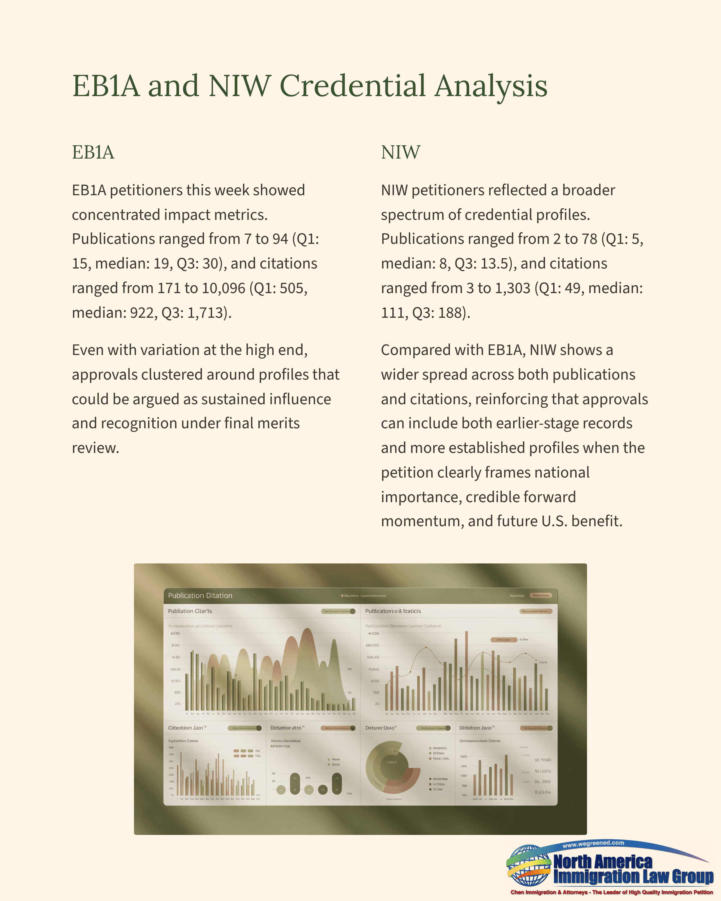 EB1A petitioners this week showed concentrated impact metrics. Publications ranged from 7 to 94 (Q1: 15, median: 19, Q3: 30), and citations ranged from 171 to 10,096 (Q1: 505, median: 922, Q3: 1,713). Even with variation at the high end, approvals clustered around profiles that could be argued as sustained influence and recognition under final merits review.NIW petitioners reflected a broader spectrum of credential profiles. Publications ranged from 2 to 78 (Q1: 5, median: 8, Q3: 13.5), and citations ranged from 3 to 1,303 (Q1: 49, median: 111, Q3: 188). Compared with EB1A, NIW shows a wider spread across both publications and citations, reinforcing that approvals can include both earlier-stage records and more established profiles when the petition clearly frames national importance, credible forward momentum, and future U.S. benefit.