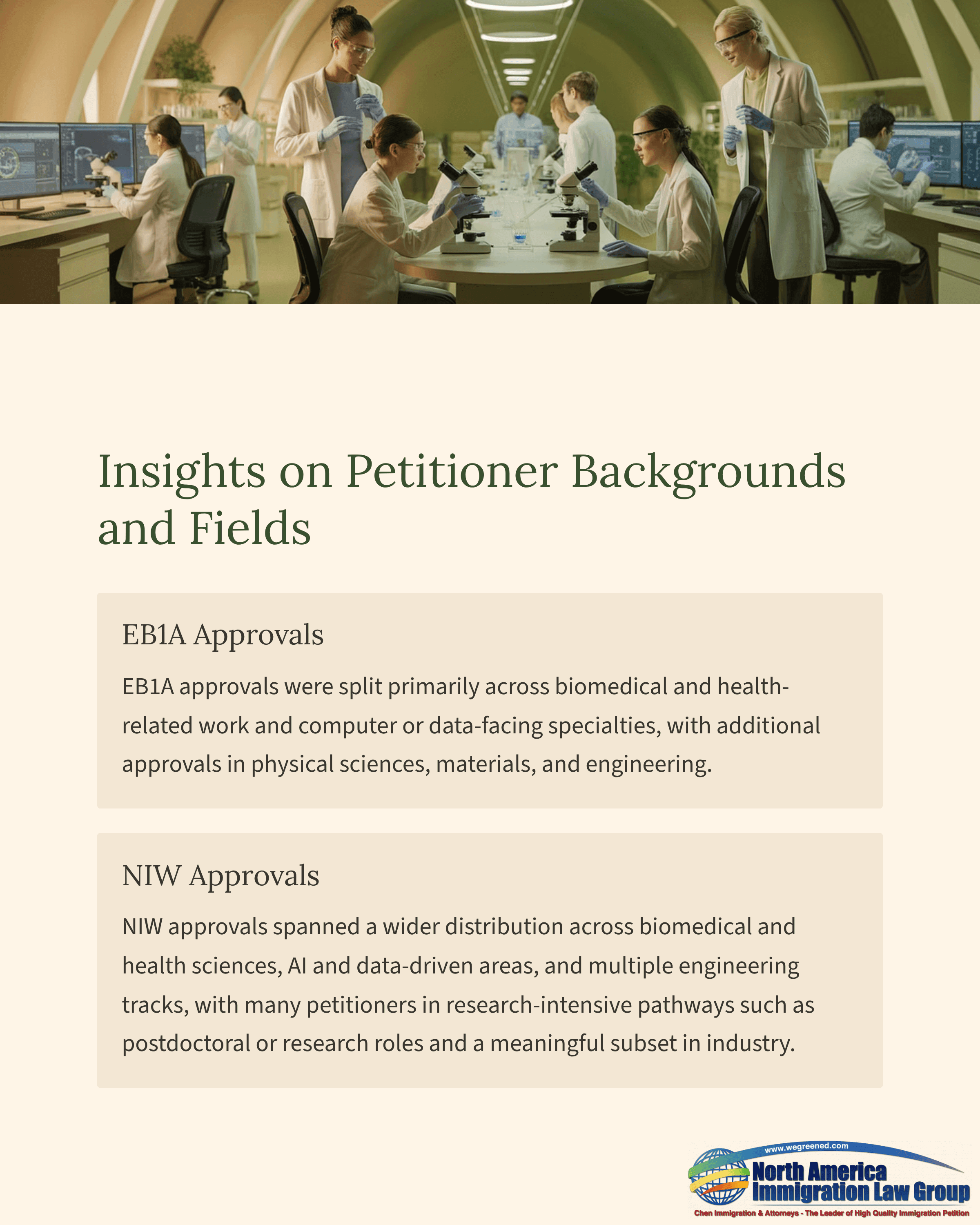 EB1A approvals were split primarily across biomedical and health-related work and computer or data-facing specialties, with additional approvals in physical sciences, materials, and engineering.NIW approvals spanned a wider distribution across biomedical and health sciences, AI and data-driven areas, and multiple engineering tracks, with many petitioners in research-intensive pathways such as postdoctoral or research roles and a meaningful subset in industry.