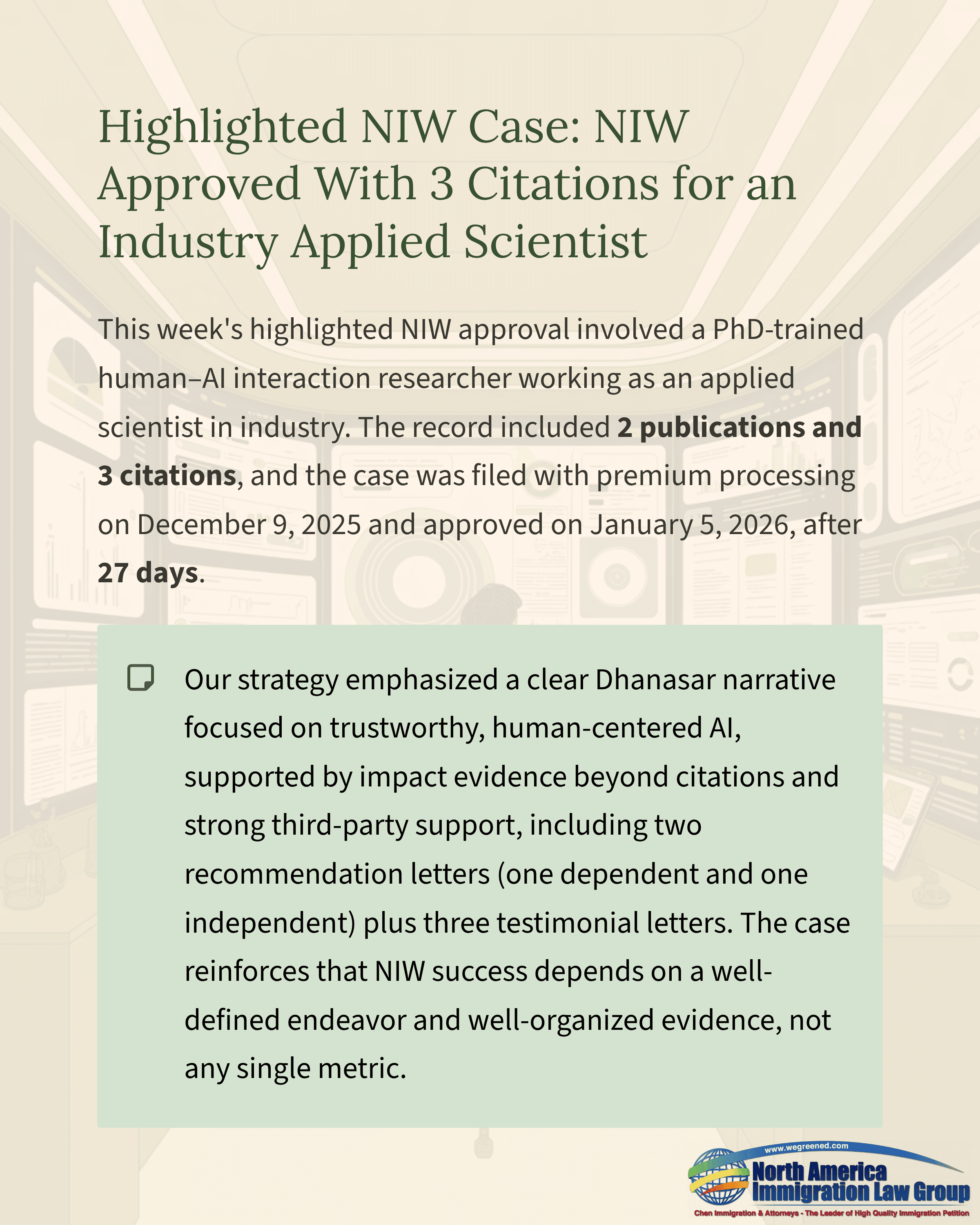 One notable NIW approval this week involved a PhD-trained human–AI interaction researcher working as an applied scientist in industry. The petitioner’s work focuses on building human-centered AI frameworks that integrate behavioral science into AI and large language model design, helping improve how AI systems perform and how they are used in real-world settings. The record included 2 publications and 3 citations. The case was filed with premium processing on December 9, 2025, and approved on January 5, 2026, after 27 days of processing.From a strategy perspective, we built the petition to keep the officer’s review evidence-driven and easy to follow under the Dhanasar framework, even with a low citation total. We anchored the proposed endeavor in the practical need for trustworthy, human-centered AI systems, then highlighted field-appropriate indicators of influence beyond citations, including how the work is positioned for real-world adoption and measurable improvements in AI performance and reliability. To strengthen third-party validation, the case was supported by two expert recommendation letters, including one dependent recommender and one independent recommender, along with three testimonial letters that reinforced real-world relevance and corroborated the petitioner’s role and contributions in an applied setting. To strengthen the “well-positioned” showing, we organized the record around execution ability, implementation context, and a demonstrated capacity to advance the work in an industry environment. For the final prong, we explained why a waiver supports broader U.S. benefit by enabling flexibility and scale, allowing the petitioner to extend impact through collaboration and wider deployment rather than being limited to a single employer pathway.