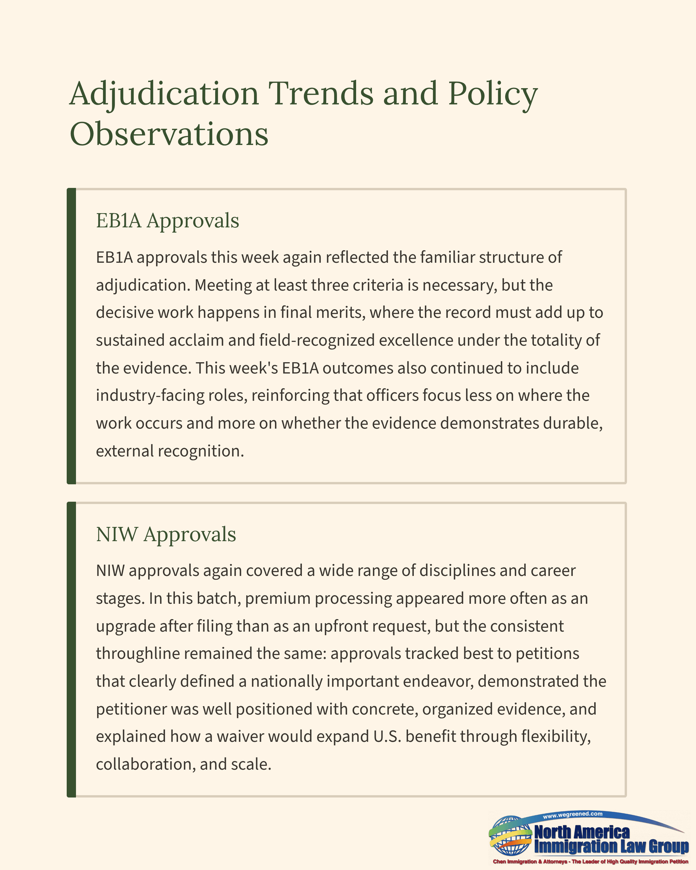 EB1A approvals this week again reflected the familiar structure of adjudication. Meeting at least three criteria is necessary, but the decisive work happens in final merits, where the record must add up to sustained acclaim and field-recognized excellence under the totality of the evidence. This week’s EB1A outcomes also continued to include industry-facing roles, reinforcing that officers focus less on where the work occurs and more on whether the evidence demonstrates durable, external recognition.NIW approvals again covered a wide range of disciplines and career stages. In this batch, premium processing appeared more often as an upgrade after filing than as an upfront request, but the consistent throughline remained the same: approvals tracked best to petitions that clearly defined a nationally important endeavor, demonstrated the petitioner was well positioned with concrete, organized evidence, and explained how a waiver would expand U.S. benefit through flexibility, collaboration, and scale.