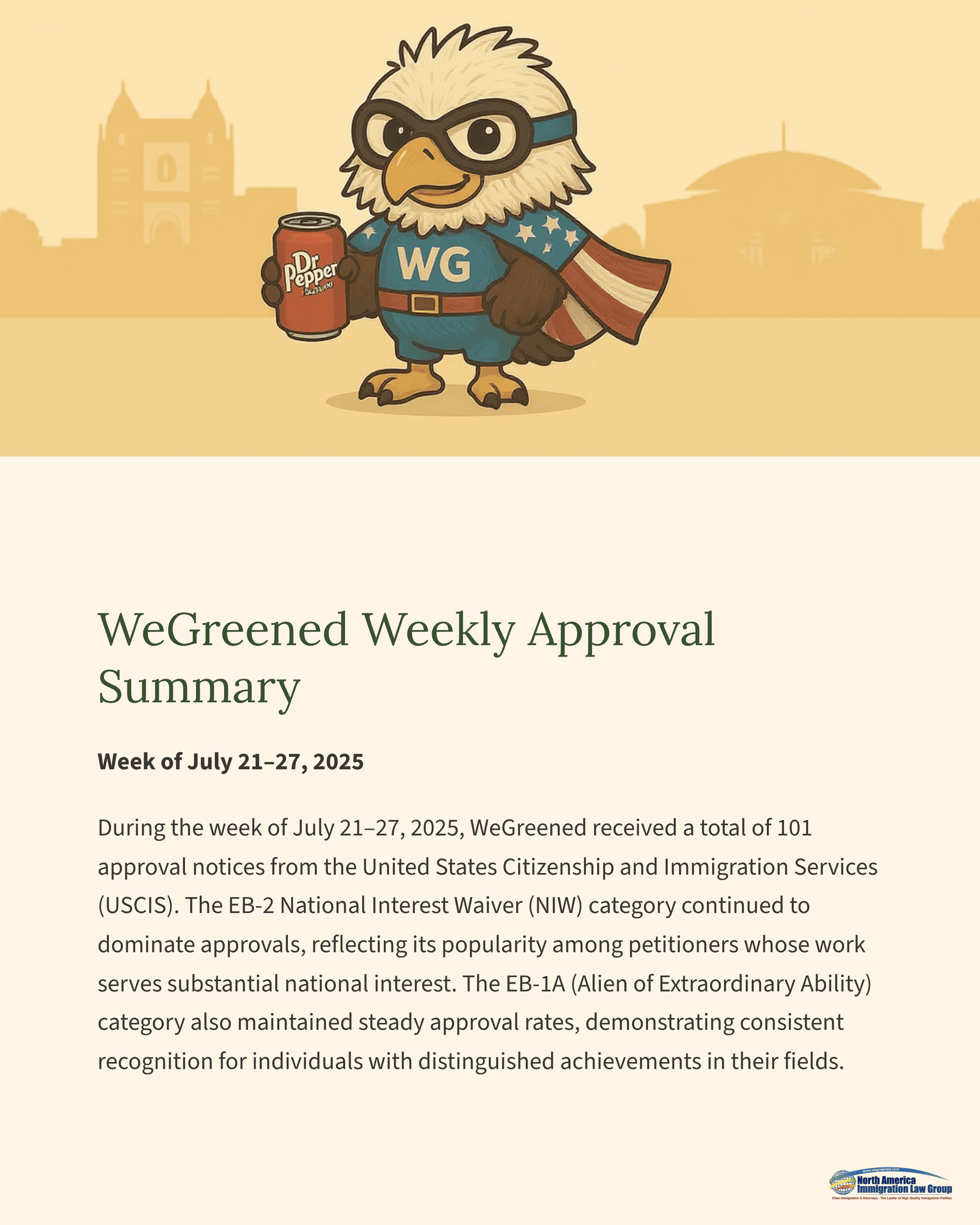 During the week of July 21–27, 2025, WeGreened received a total of 101 approval notices from the United States Citizenship and Immigration Services (USCIS). The EB-2 National Interest Waiver (NIW) category continued to dominate approvals, reflecting its popularity among petitioners whose work serves substantial national interest. The EB-1A (Alien of Extraordinary Ability) category also maintained steady approval rates, demonstrating consistent recognition for individuals with distinguished achievements in their fields.