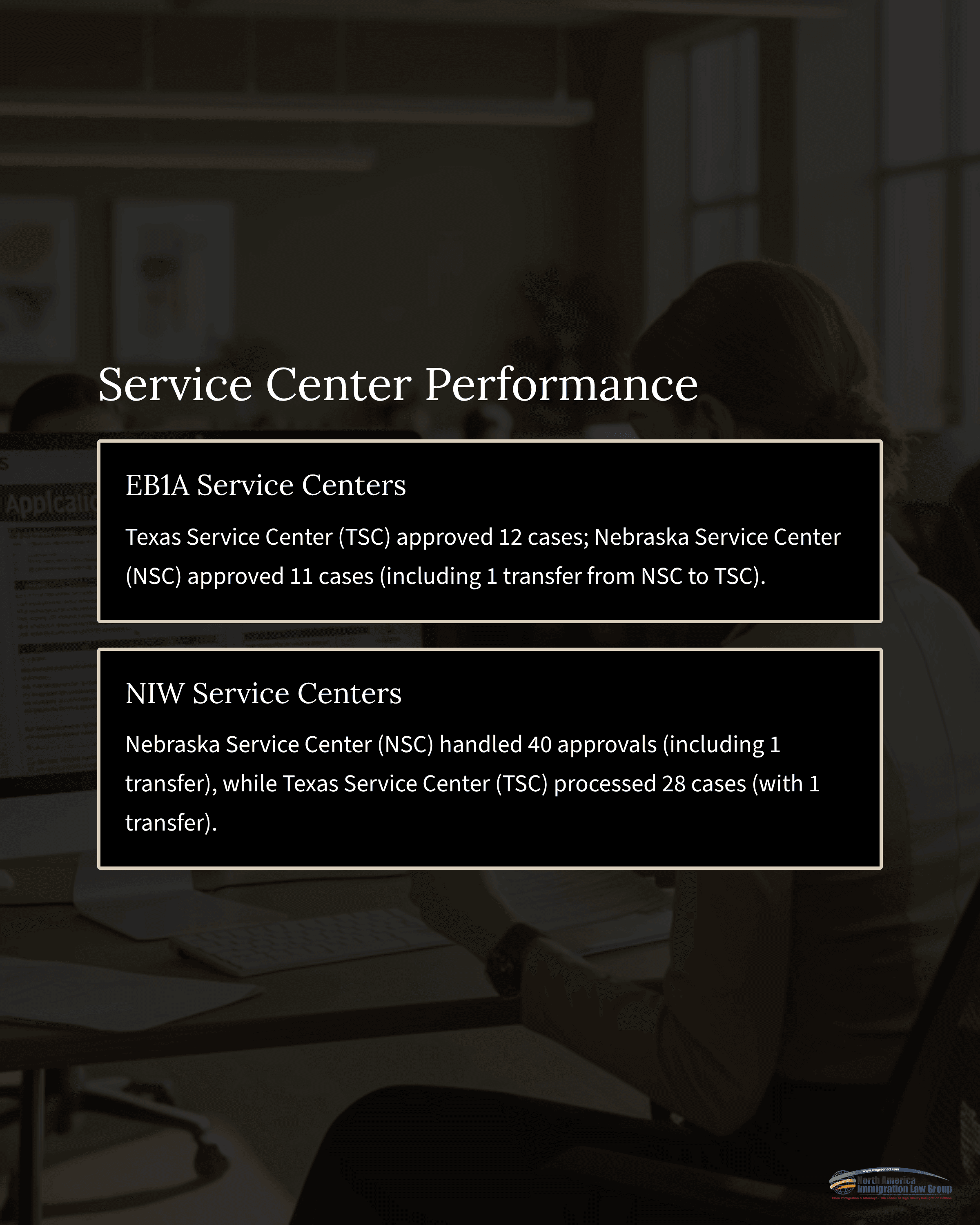 Of the 101 approvals, 68 were for NIW, 24 for EB1A, 4 for EB1B (Outstanding Professors or Researchers), and 5 for O1A (Individuals with Extraordinary Ability or Achievement). The Nebraska Service Center processed 11 EB1A and 39 NIW approvals, while the Texas Service Center handled 12 EB1A and 27 NIW approvals. One EB1A and one NIW case were transferred from NSC to TSC, and one NIW case was transferred from TSC to NSC.EB1A and NIW Credential Analysis