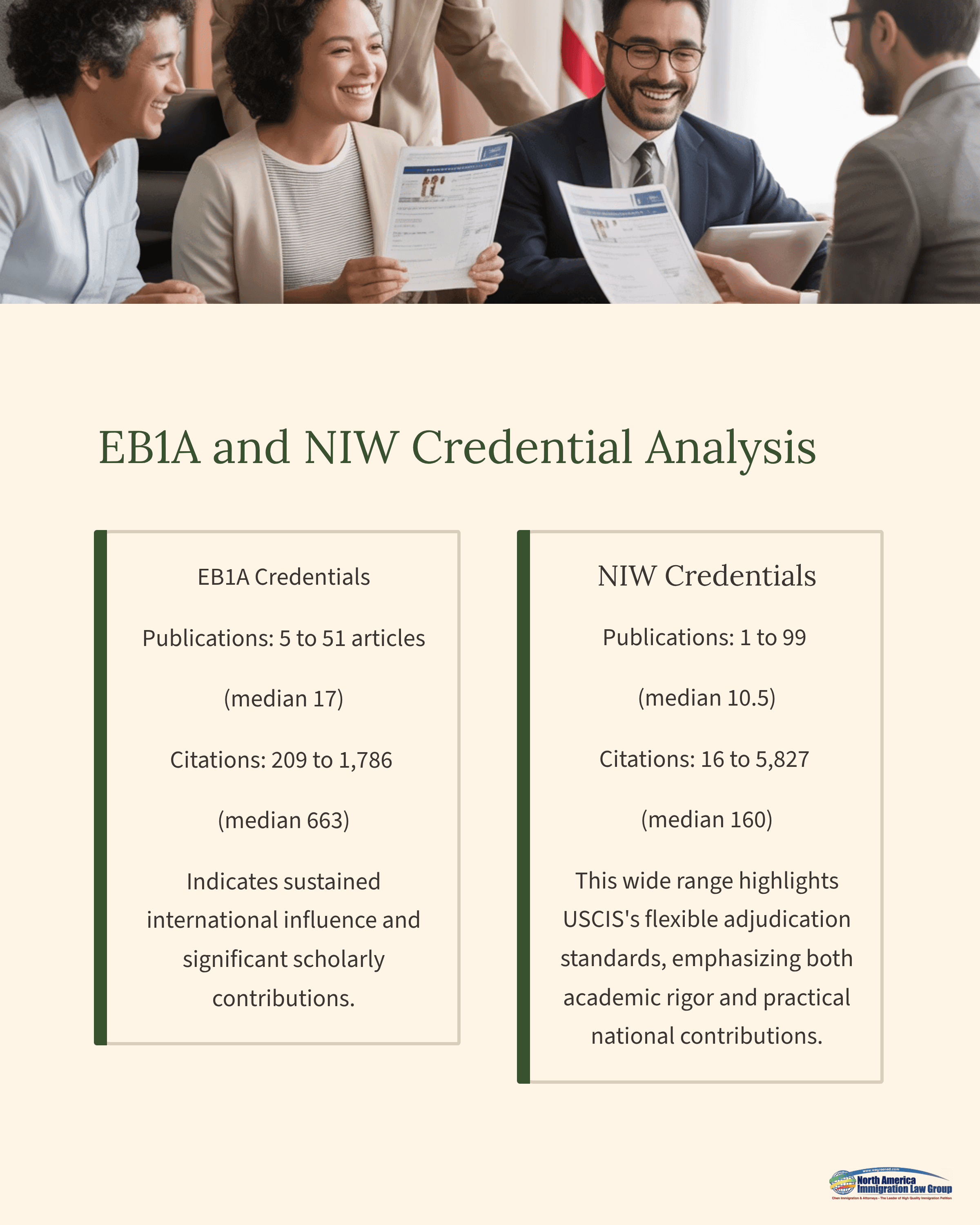 EB1A petitioners showcased robust academic productivity, with publications ranging from 5 to 51 articles (median 17) and citations between 209 and 1,786 (median 663). This indicates sustained international influence and significant scholarly contributions.NIW petitioners displayed diverse academic outputs, from 1 to 99 publications (median 10.5) and citations between 16 and 5,827 (median 160). This wide range highlights USCIS’s flexible adjudication standards, emphasizing both academic rigor and practical national contributions.