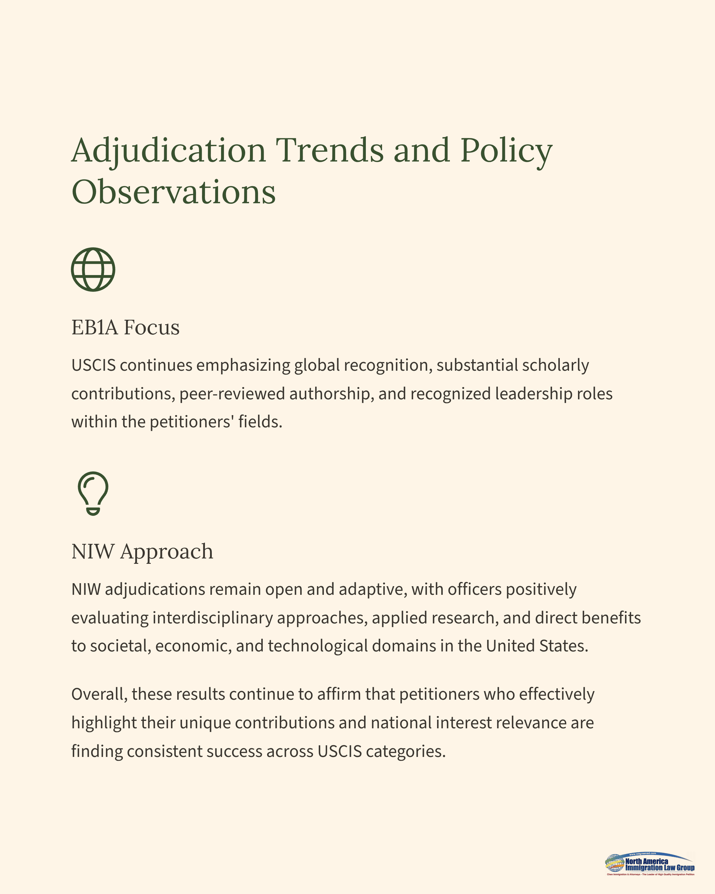 For EB1A, USCIS continues emphasizing global recognition, substantial scholarly contributions, peer-reviewed authorship, and recognized leadership roles within the petitioners' fields. In contrast, NIW adjudications remain open and adaptive, with officers positively evaluating interdisciplinary approaches, applied research, and direct benefits to societal, economic, and technological domains in the United States.Overall, these results continue to affirm that petitioners who effectively highlight their unique contributions and national interest relevance are finding consistent success across USCIS categories.