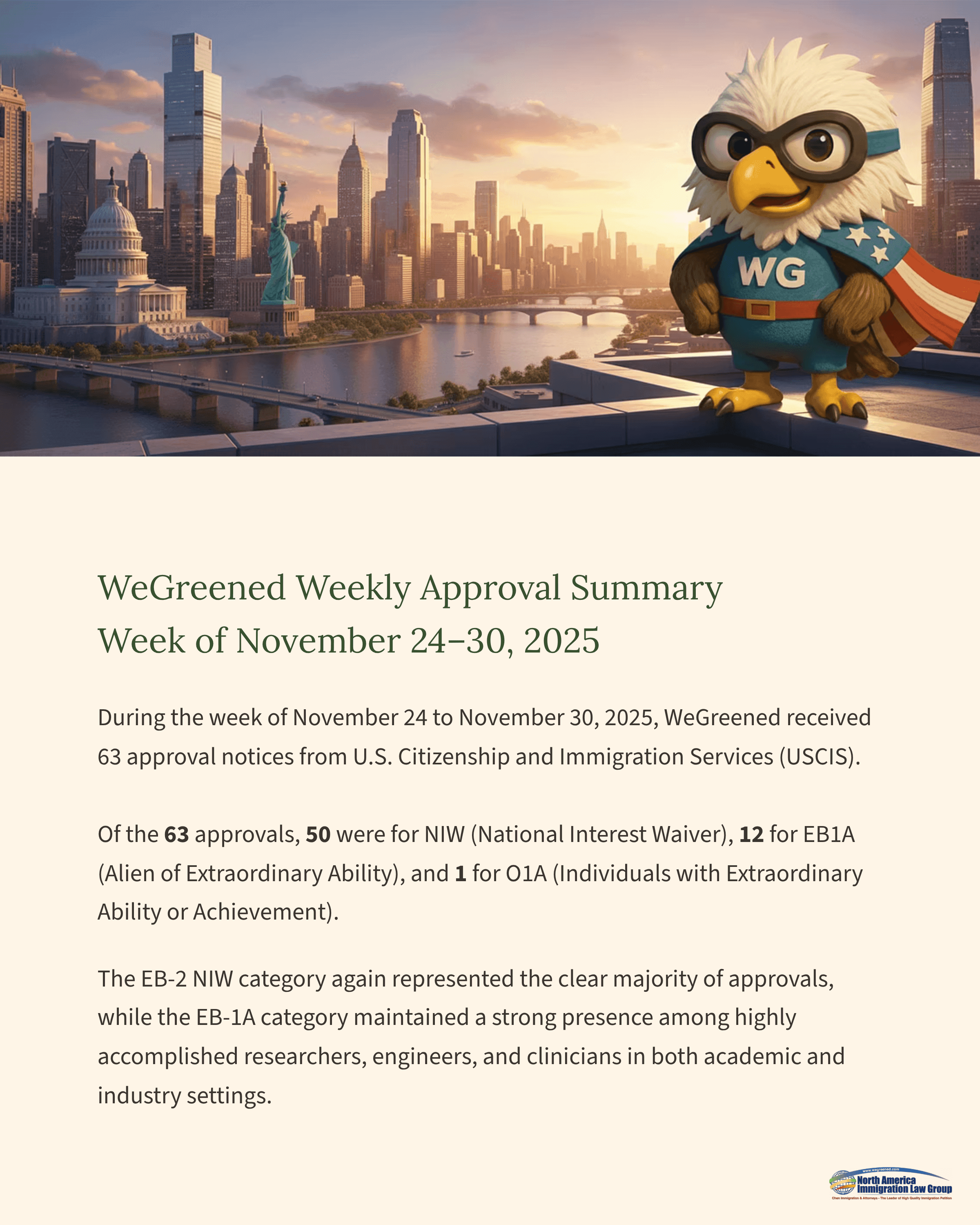 During the week of November 24 to November 30, 2025, WeGreened received 63 approval notices from U.S. Citizenship and Immigration Services (USCIS). Of the 63 approvals, 50 were for NIW (National Interest Waiver), 12 for EB1A (Alien of Extraordinary Ability), and 1 for O1A (Individuals with Extraordinary Ability or Achievement). The EB-2 NIW category again represented the clear majority of approvals, while the EB-1A category maintained a strong presence among highly accomplished researchers, engineers, and clinicians in both academic and industry settings.