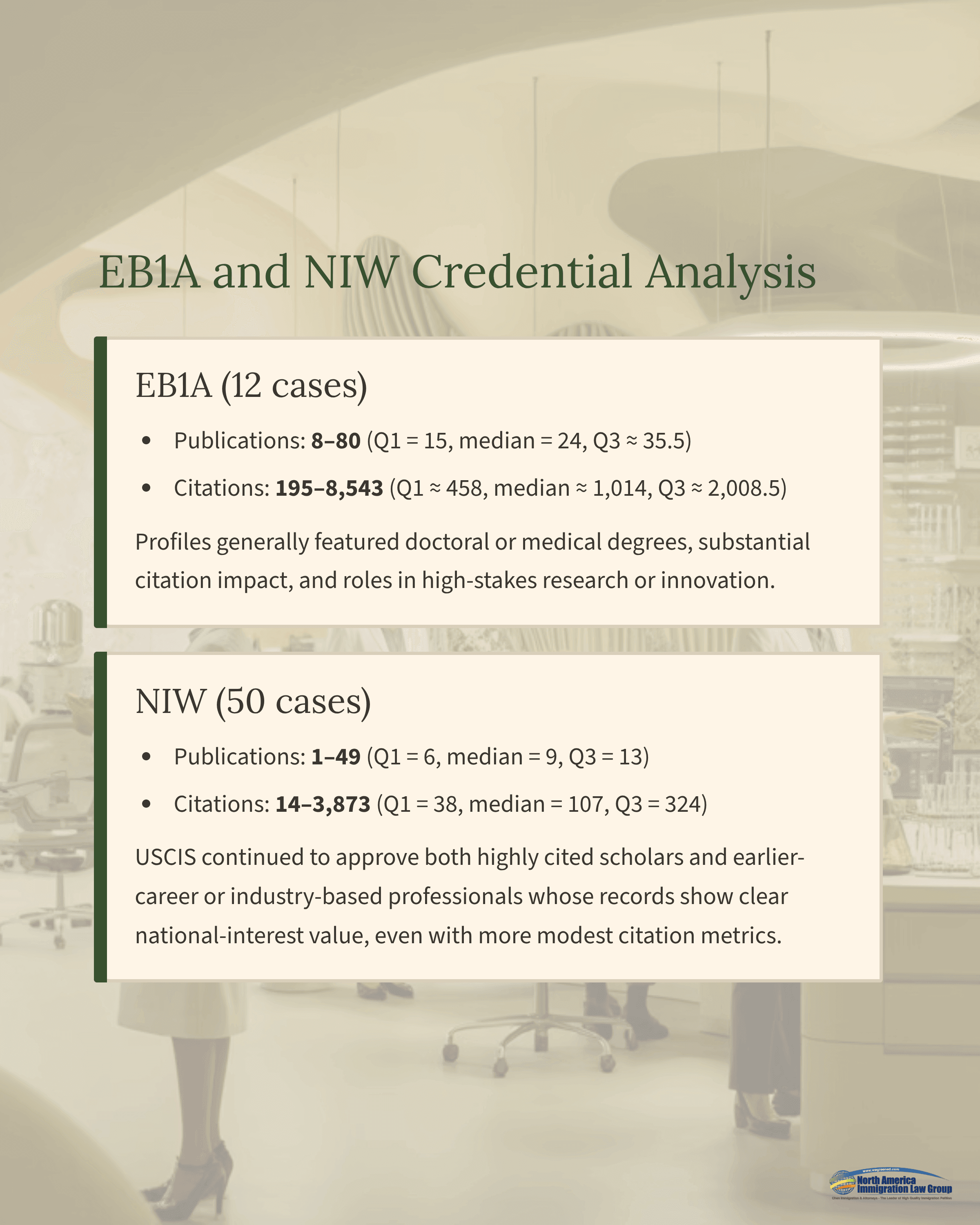 EB1A petitioners demonstrated strong and concentrated scholarly productivity, with publications ranging from 8 to 80 (Q1: 15, median 24, Q3 ≈ 35.5) and citations between 195 and 8,543 (Q1 ≈ 458, median ≈ 1,014, Q3 ≈ 2,008.5). These figures reflect substantial academic achievement and international impact, with most EB1A approvals clustering in the mid-teens to mid-thirties for publication counts and several hundred to a few thousand citations, along with a small number of highly cited outliers in the thousands. Almost all EB1A petitioners held doctoral or medical degrees and worked in STEM or clinically adjacent disciplines, often combining traditional academic records with leadership in high-stakes research or innovation projects.