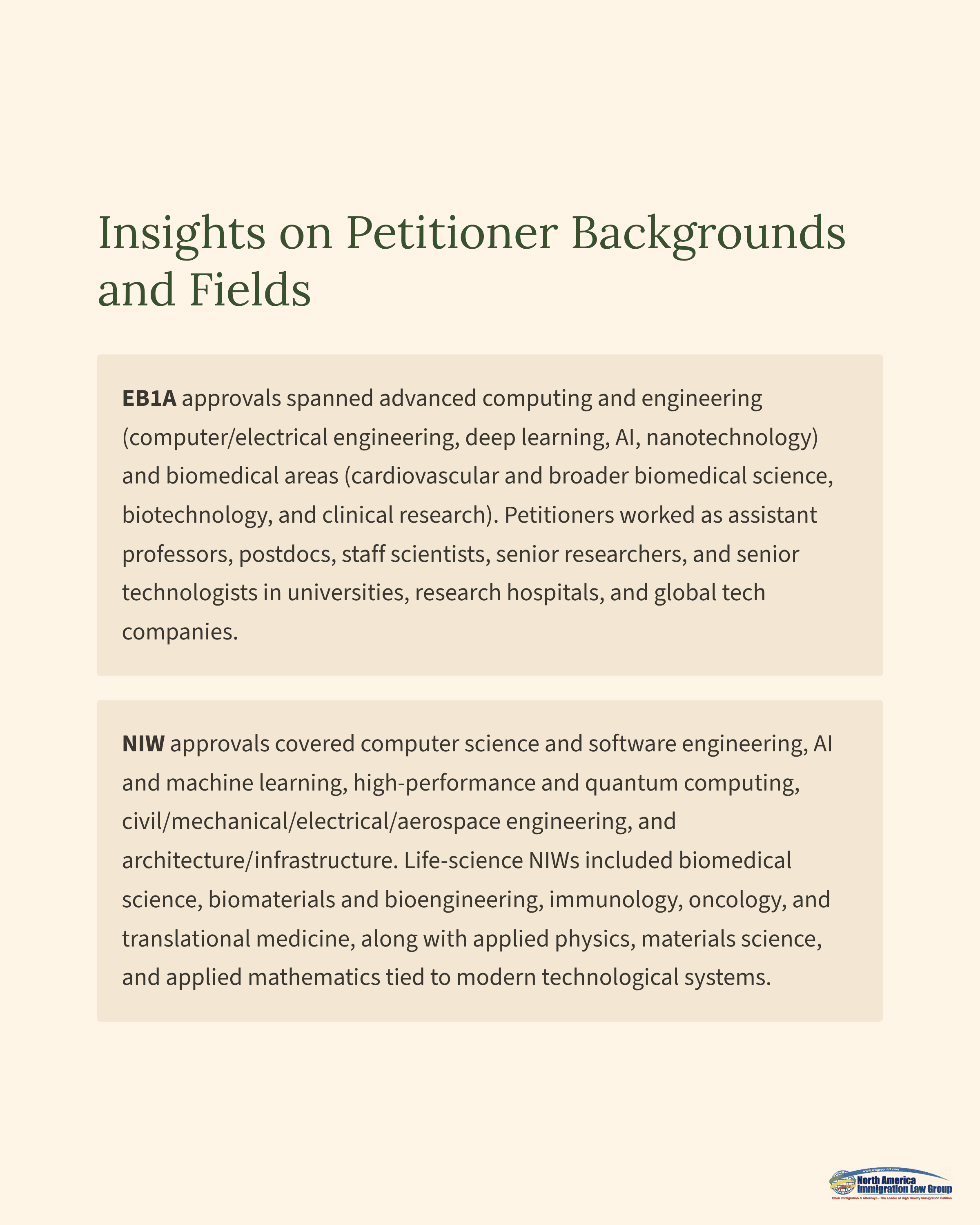 NIW approvals covered computer science and software engineering, artificial intelligence and machine learning, high-performance computing, quantum and advanced scientific computing, civil, mechanical, electrical, and aerospace engineering, and architecture and infrastructure-related fields. Life science and health-related NIW fields included biomedical science, biomaterials and bioengineering, immunology, oncology-related research, and broader clinical and translational medicine. Other nationally important areas included applied physics, materials science, and applied mathematics tied to modern technological systems. Profiles frequently included Ph.D. students, postdoctoral researchers, assistant professors, research scientists, applied scientists and engineers in industry, as well as clinicians and healthcare professionals whose projects align with U.S. priorities in AI and digital infrastructure, scientific competitiveness, energy efficiency, public health, and resilient critical systems.