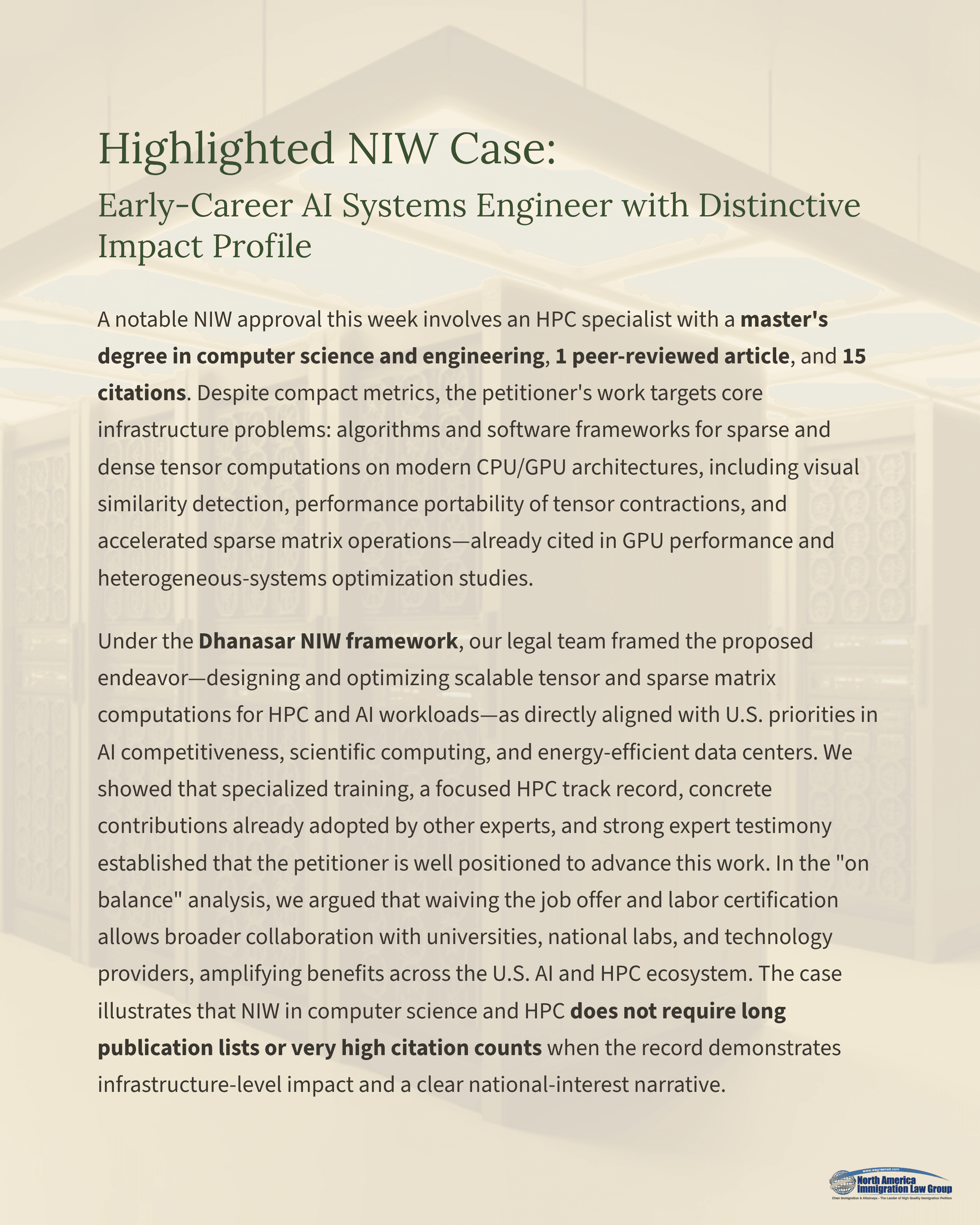 Our legal team framed the case under the Dhanasar NIW framework by emphasizing how the proposed endeavor—designing and optimizing efficient, scalable tensor and sparse matrix computations for HPC and AI workloads—directly aligns with U.S. priorities in AI competitiveness, scientific computing capacity, and energy-conscious data-center operations. We showed that the petitioner is well positioned to advance this endeavor through specialized graduate training, a focused track record in HPC, concrete technical contributions already adopted by other experts, and strong expert support explaining how impact is measured in this field. In the “on balance” analysis, we argued that waiving the job offer and labor certification would allow the petitioner to collaborate flexibly with universities, national laboratories, and technology providers, amplifying benefits across the broader U.S. AI and HPC ecosystem rather than limiting contributions to a single employer. This result underscores that NIW in computer science and HPC is not reserved only for long publication lists or very high citation counts; a targeted infrastructure-level contribution, early evidence of external uptake, and a clear national-interest narrative can be equally decisive.