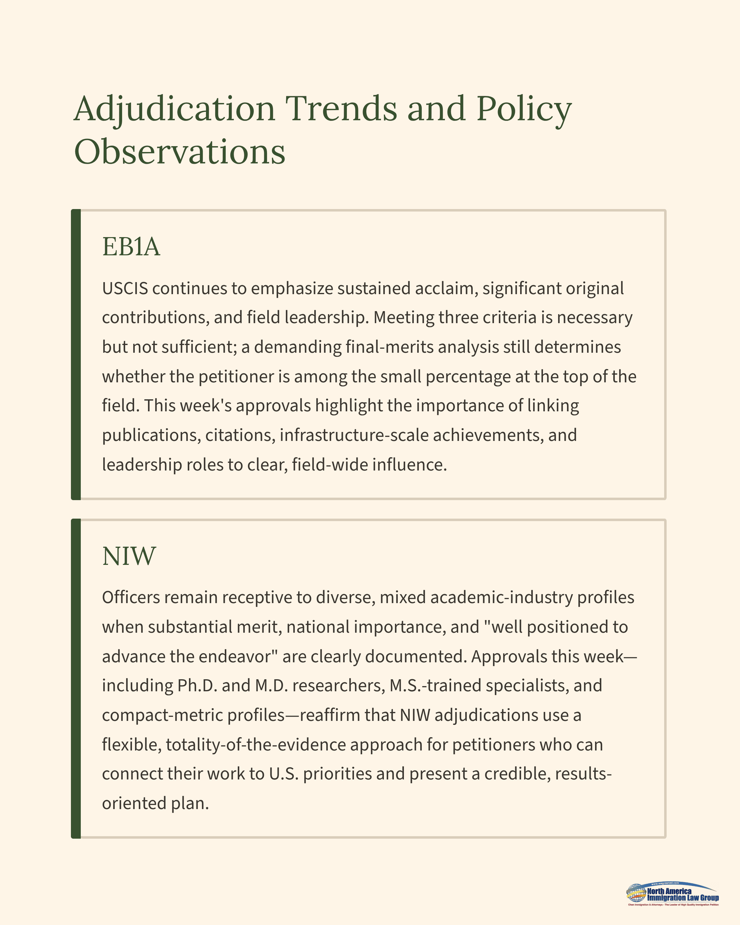 NIW: Officers remain receptive to diverse academic and industry profiles when the record shows substantial merit, national importance, and that the petitioner is well positioned to advance the proposed endeavor. This week’s results—including approvals for Ph.D. and M.D. researchers, M.S.-trained specialists, and compact-metric profiles—reaffirm that NIW adjudications follow a flexible, totality-of-the-evidence approach. Petitioners who clearly connect their work to documented U.S. priorities and present a credible, results-oriented plan to move that work forward—even when their metrics differ from the typical profile in their field—are well positioned for success.
