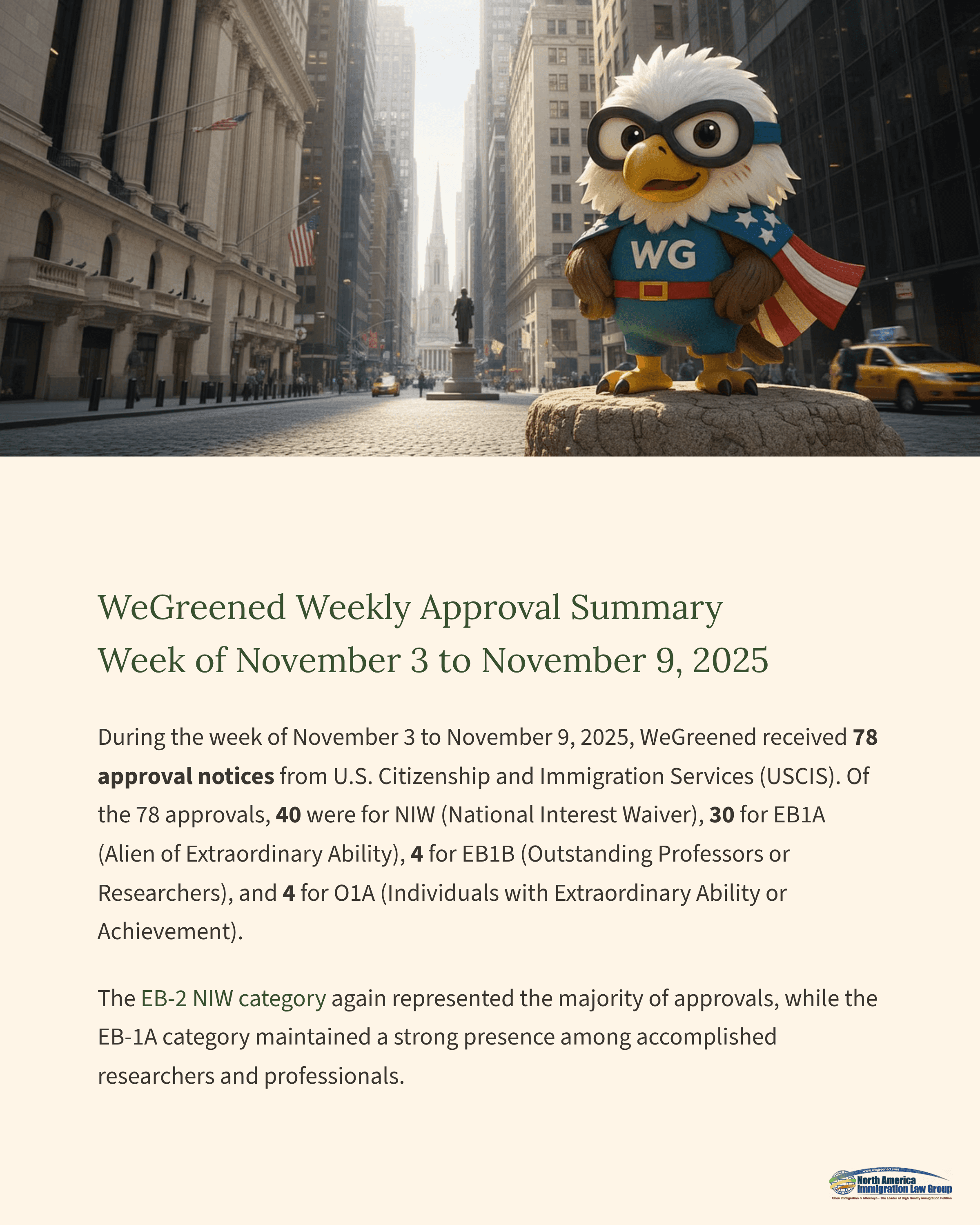 During the week of November 3 to November 9, 2025, WeGreened received 78 approval notices from U.S. Citizenship and Immigration Services (USCIS). Of the 78 approvals, 40 were for NIW (National Interest Waiver), 30 for EB1A (Alien of Extraordinary Ability), 4 for EB1B (Outstanding Professors or Researchers), and 4 for O1A (Individuals with Extraordinary Ability or Achievement). The EB-2 NIW category again represented the majority of approvals, while the EB-1A category maintained a strong presence among accomplished researchers and professionals.