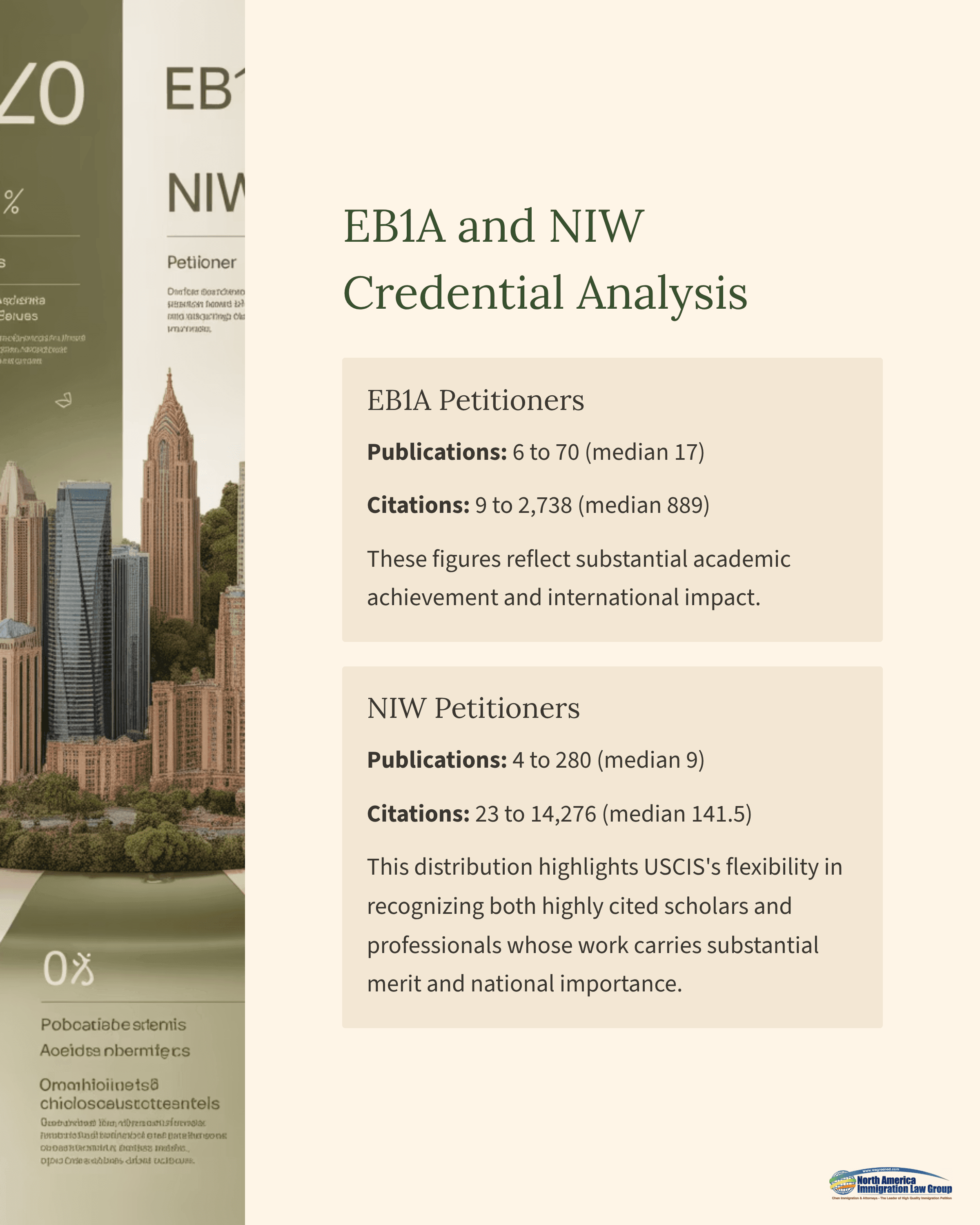 EB1A petitioners demonstrated strong scholarly productivity, with publications ranging from 6 to 70 (median 17) and citations between 9 and 2,738 (median 889). These figures reflect substantial academic achievement and international impact.