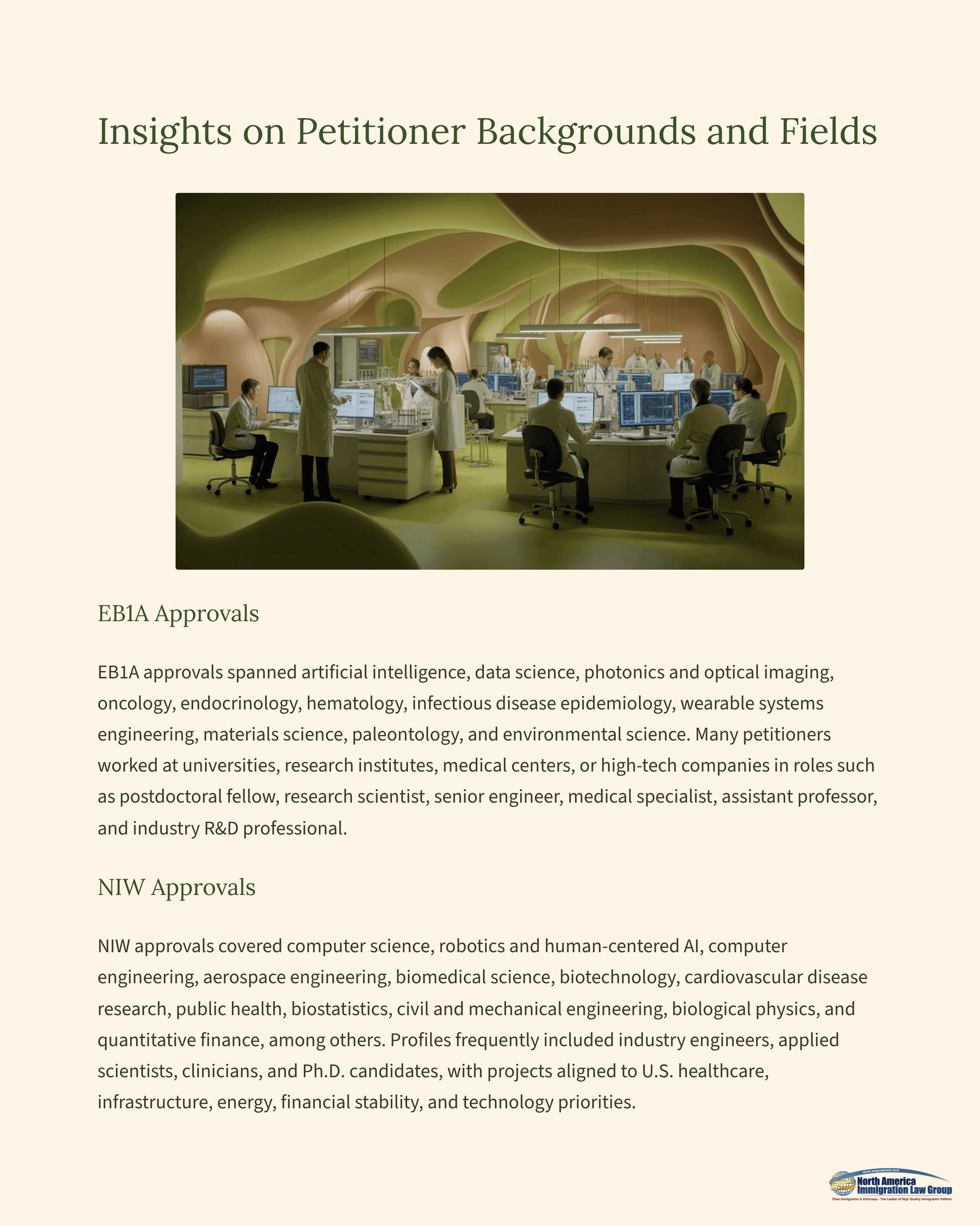 NIW approvals covered computer science, robotics and human-centered AI, computer engineering, aerospace engineering, biomedical science, biotechnology, cardiovascular disease research, public health, biostatistics, civil and mechanical engineering, biological physics, and quantitative finance, among others. Profiles frequently included industry engineers, applied scientists, clinicians, and Ph.D. candidates, with projects aligned to U.S. healthcare, infrastructure, energy, financial stability, and technology priorities.