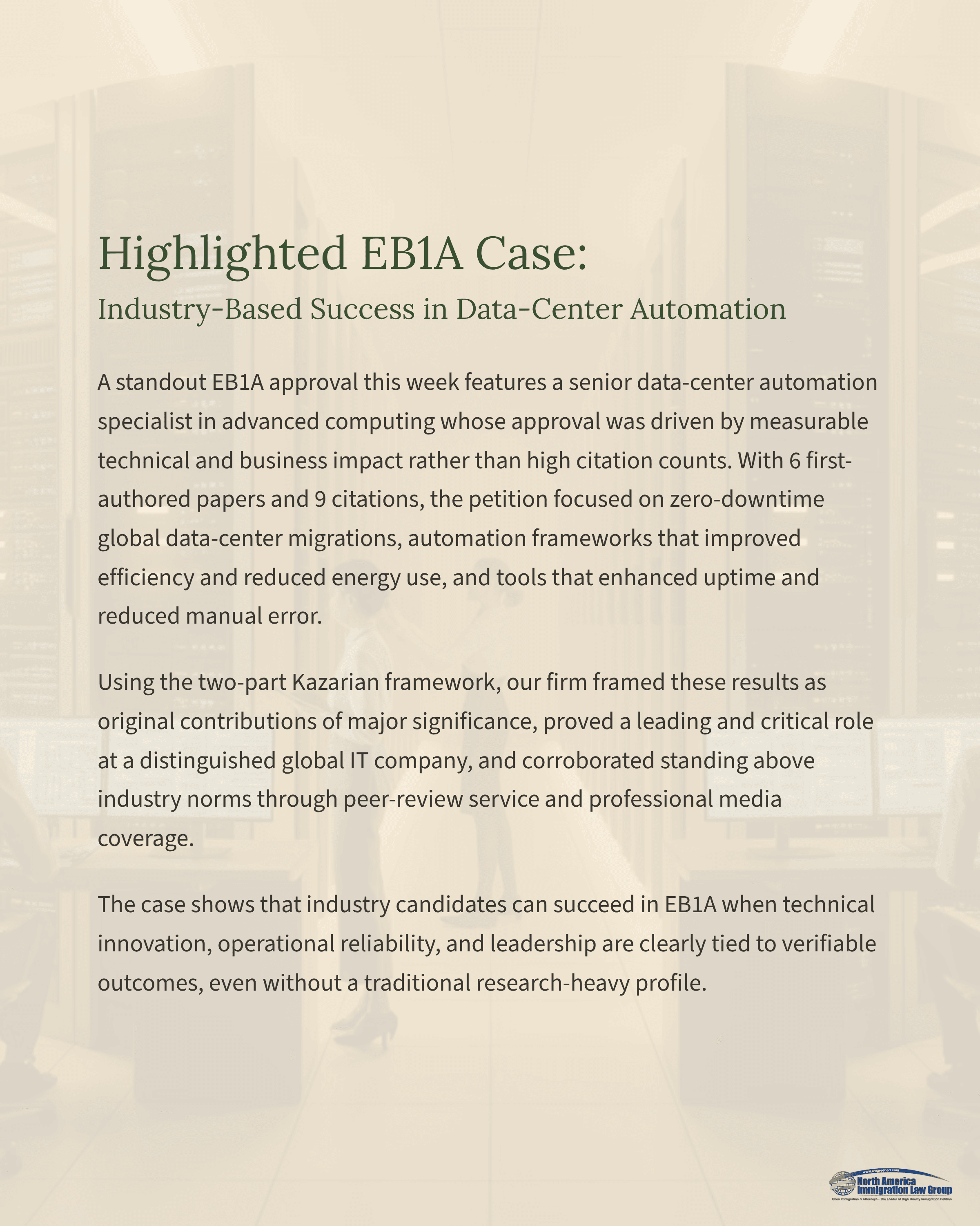 A standout EB1A approval this week features a senior data-center automation specialist in advanced computing. With 6 first-authored peer-reviewed publications and 9 citations, the petition centered not on traditional academic metrics, but on verifiable technical and business outcomes: zero-downtime global data-center migrations, automation frameworks that boosted operational efficiency, reductions in energy use, disaster-recovery strategies that ensured extremely high uptime for critical applications, and tools that significantly cut manual decommissioning steps, lowering human error and audit risk.