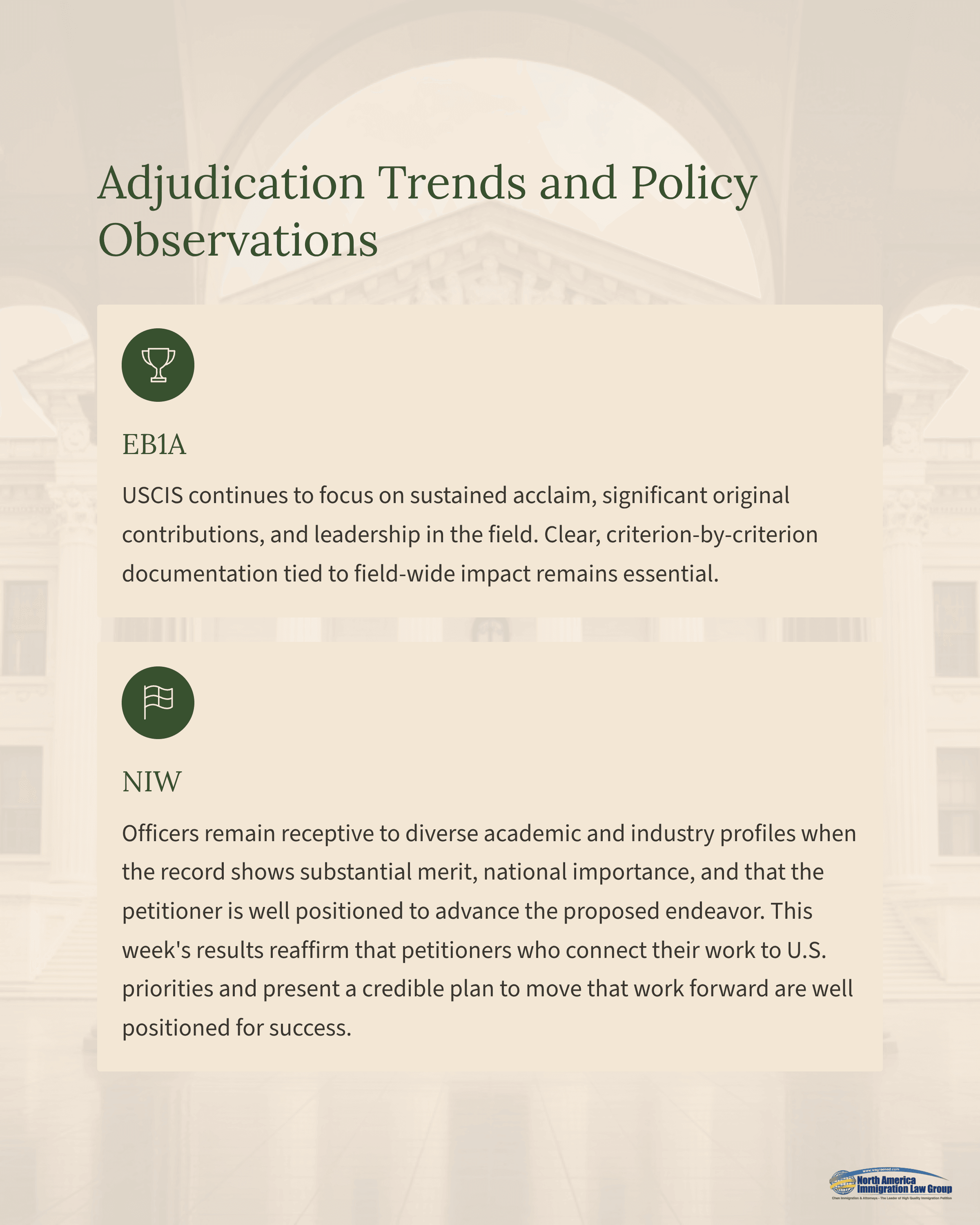 NIW: Officers remain receptive to diverse academic and industry profiles when the record shows substantial merit, national importance, and that the petitioner is well positioned to advance the proposed endeavor. This week’s results reaffirm that petitioners who connect their work to U.S. priorities and present a credible plan to move that work forward are well positioned for success.